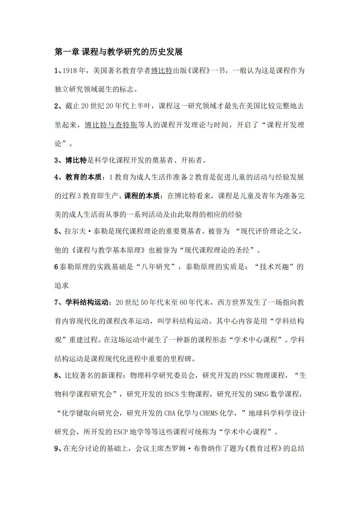 第一章课程与教学研究的历史发展 1、1918年,美国著名教育学者博比特出版《课程》一书,一般认为这是课程作为独立研究领域诞生的标志。2、截止20世纪20年代上半叶,课程这一研究领域才最先在美国比较完整地去里起来,博比特与查特斯等人的课程开发理论与时间,开启了“课程开发理论”。3、博比特是科学化课程开发的奠基者、开拓者。4、教育的本质:1教育为成人生活作准备2教育是促进儿童的活动与经验发展的过程3教育即生产。课程的本质:在博比特看来,课程是儿童及青年为准备完美的成人生活而从事的一系列活动及由此取得的相应的经验5、拉尔夫·泰勒是现代课程理论的重要奠基者。被誉为“现代评价理论之父。他的《课程与教学基...