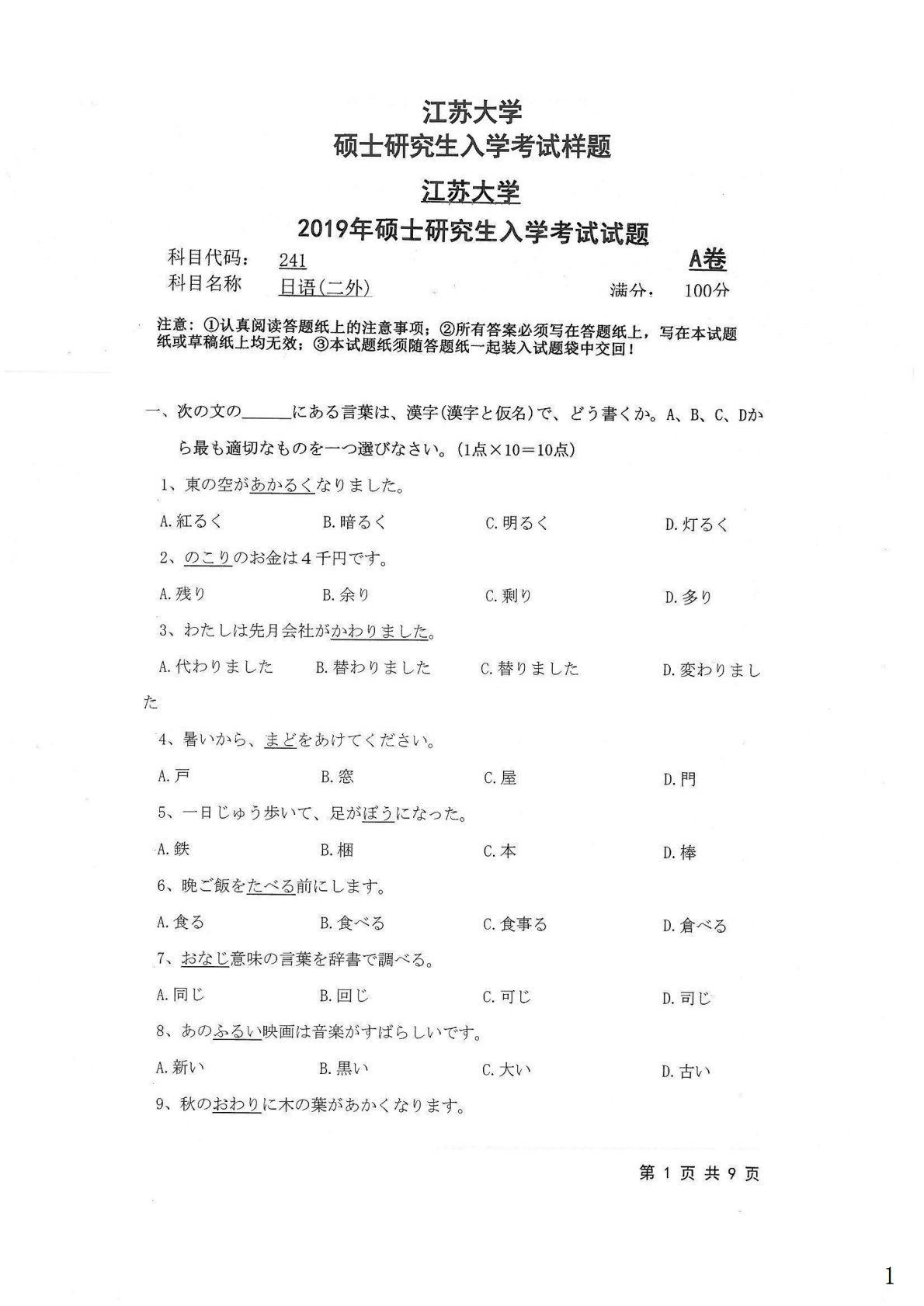 江苏大学241日语(二外)2012年真题