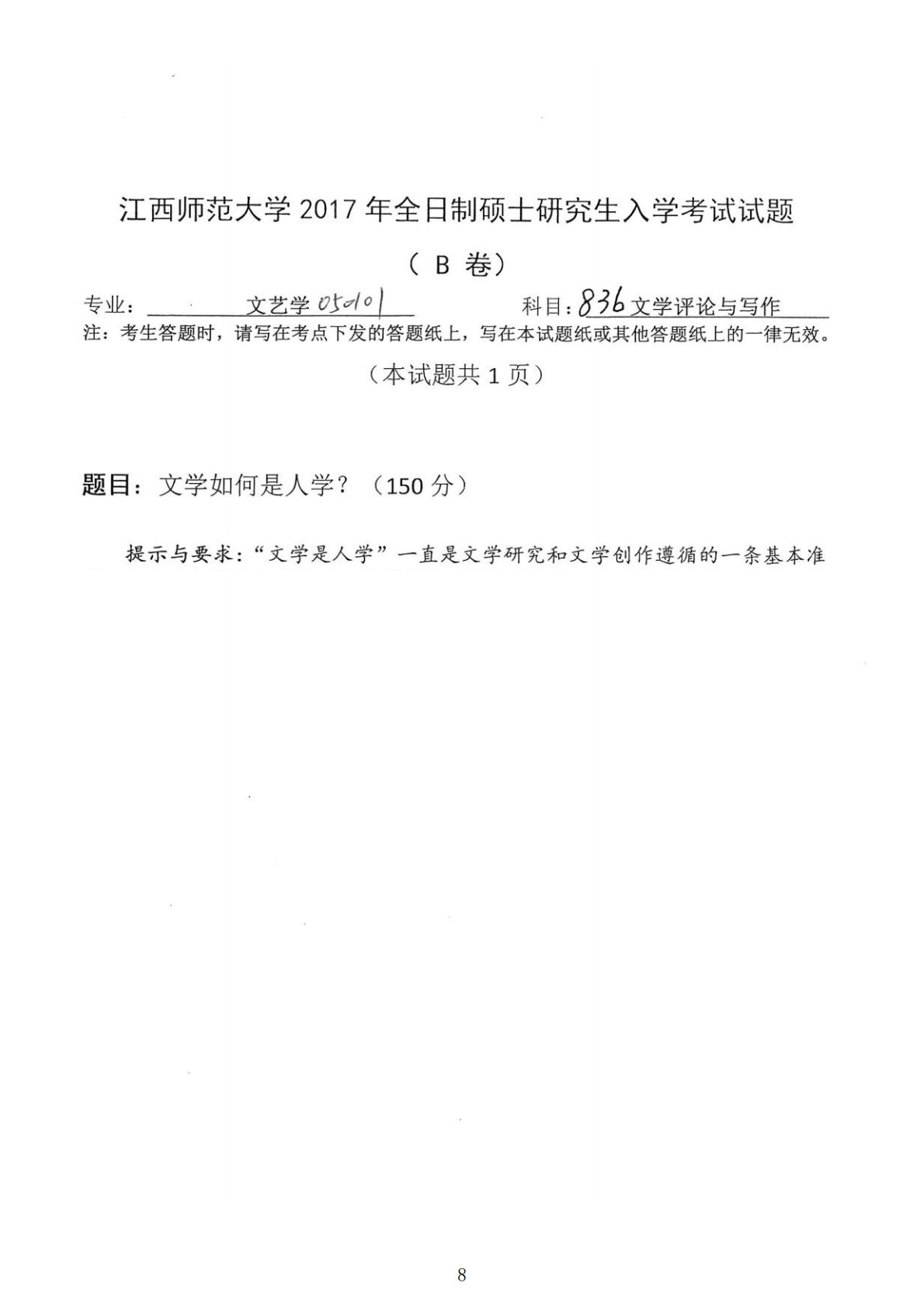 江西师范大学836文学评论与写作2017年真题