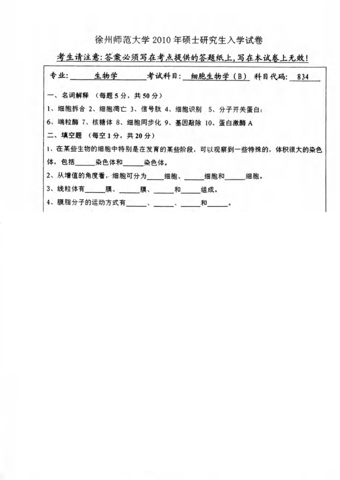 江苏师范大学854细胞生物学2010年真题