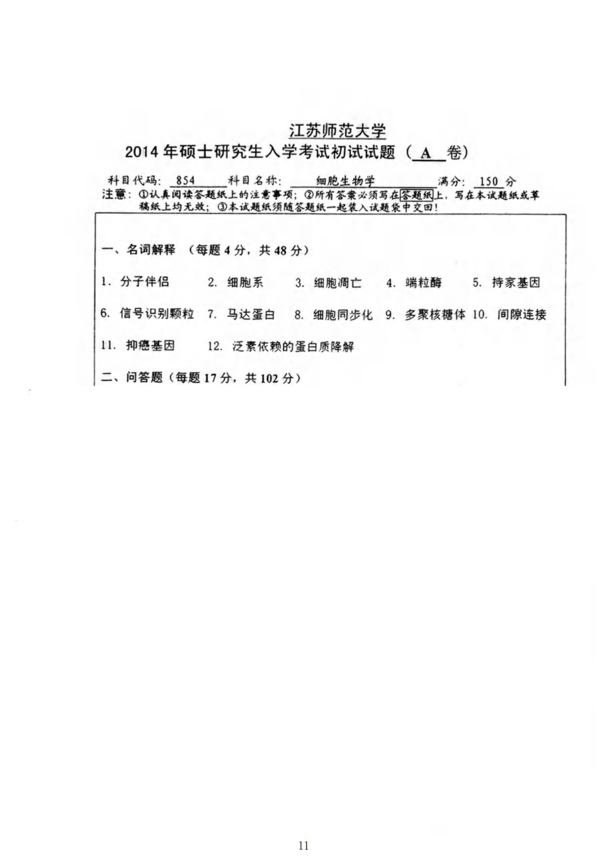 江苏师范大学854细胞生物学2014年真题