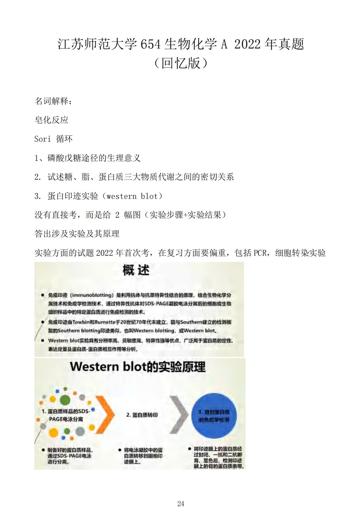 江苏师范大学654生物化学A2022年真题(回忆版)名词解释:皂化反应Sori循环1、磷酸戊糖途径的生理意义2.试述糖、脂、蛋白质三大物质代谢之间的密切关系3.蛋白印迹实验(westernblot)没有直接考,而是给2幅图(实验步骤+实验结果)答出涉及实验及其原理实验方面的试题2022年首次考,在复习方面要偏重,包括PCR,细胞转染实验2425百校文库—海量高校资料共享库百校文库是一个线上大学生专业学习资料共享平台,致力于通过用户自主上传与分享,打造一个涵盖各大高校、各学科门类的免费资源中心。平台已积累50万+套历年真题与100万+条学习文档,覆盖绝大多数高校专业,所有资料均由各大高校学生自主...
