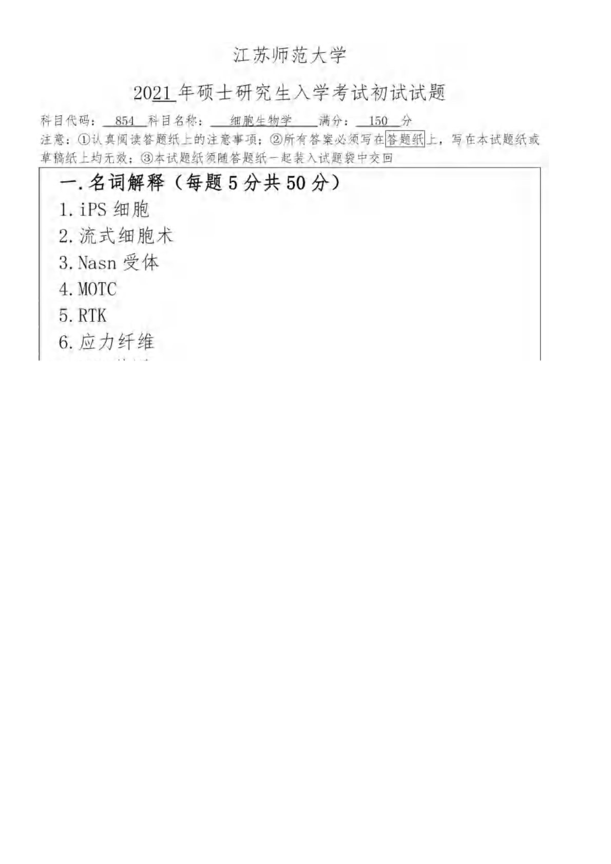 江苏师范大学854细胞生物学2021年真题