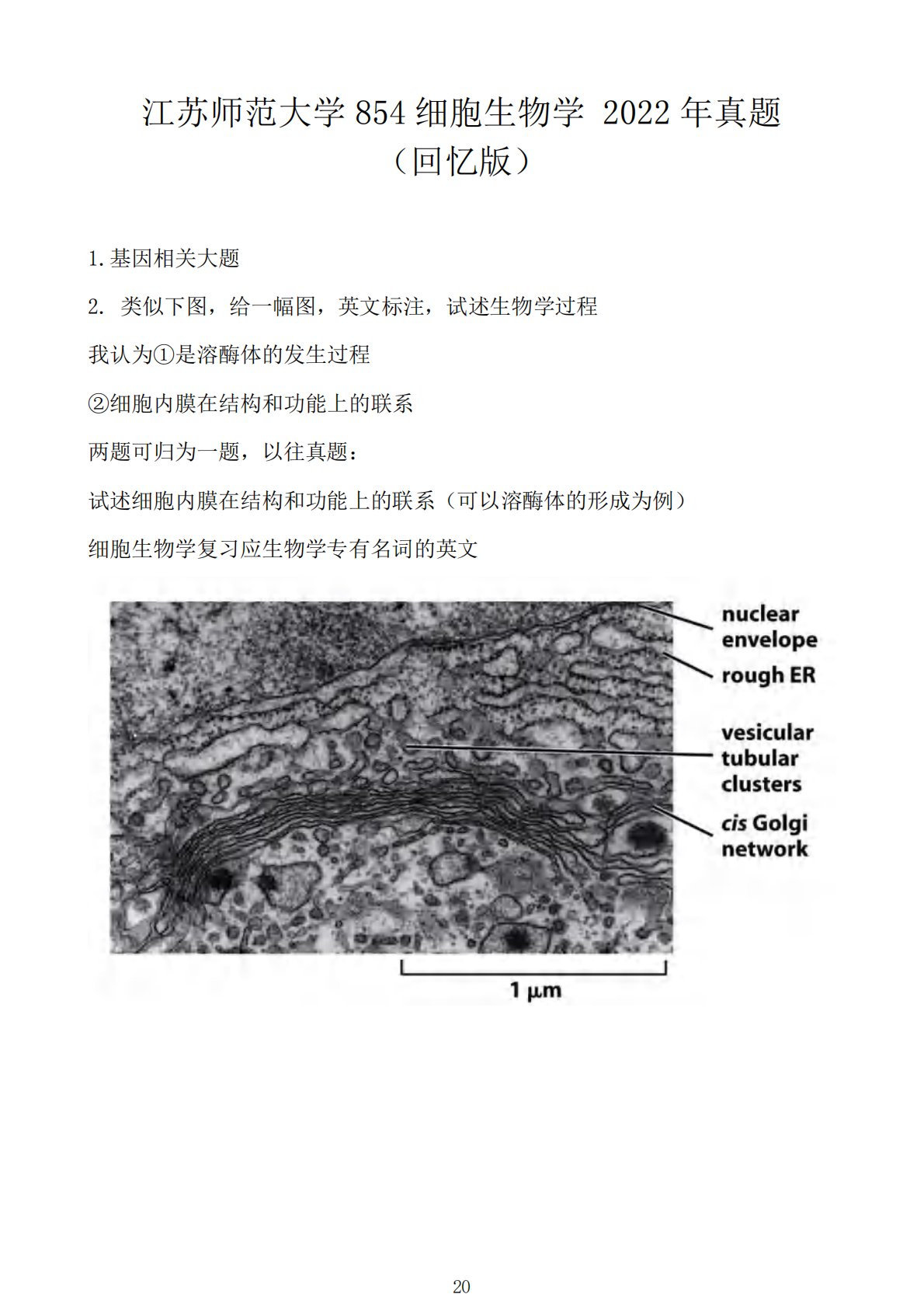江苏师范大学854细胞生物学2022年真题(回忆版)1.基因相关大题2.类似下图,给一幅图,英文标注,试述生物学过程我认为①是溶酶体的发生过程②细胞内膜在结构和功能上的联系两题可归为一题,以往真题:试述细胞内膜在结构和功能上的联系(可以溶酶体的形成为例)细胞生物学复习应生物学专有名词的英文2021百校文库—海量高校资料共享库百校文库是一个线上大学生专业学习资料共享平台,致力于通过用户自主上传与分享,打造一个涵盖各大高校、各学科门类的免费资源中心。平台已积累50万+套历年真题与100万+条学习文档,覆盖绝大多数高校专业,所有资料均由各大高校学生自主上传。✅资料透明,直观预览新增全站资料目录功能,...
