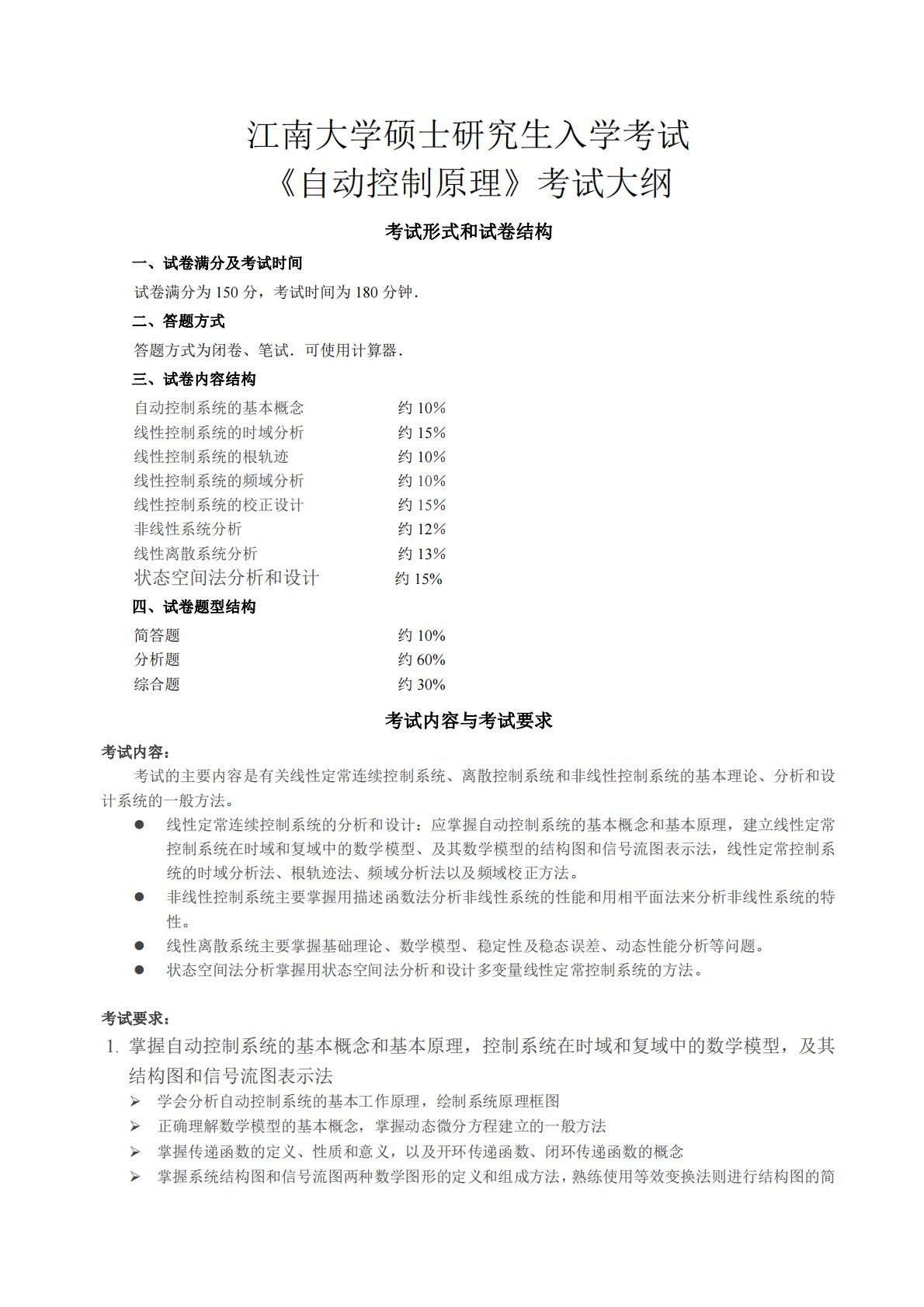 江南大学807自动控制原理2021年考试大纲(官方资料)