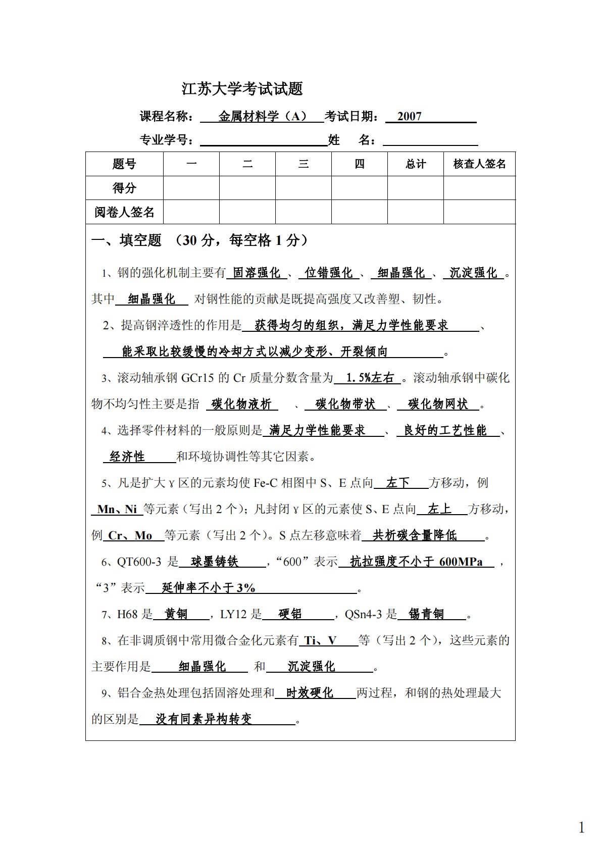 江苏大学考试试题课程名称:金属材料学(A)考试日期:2007专业学号:姓名:题号一二三四总计核查人签名得分阅卷人签名一、填空题(30分,每空格1分)1、钢的强化机制主要有固溶强化、位错强化、细晶强化、沉淀强化。其中细晶强化对钢性能的贡献是既提高强度又改善塑、韧性。2、提高钢淬透性的作用是获得均匀的组织,满足力学性能要求、能采取比较缓慢的冷却方式以减少变形、开裂倾向。3、滚动轴承钢GCr15的Cr质量分数含量为1.5%左右。滚动轴承钢中碳化物不均匀性主要是指碳化物液析、碳化物带状、碳化物网状。4、选择零件材料的一般原则是满足力学性能要求、良好的工艺性能、经济性和环境协调性等其它因素。5、凡是扩大...