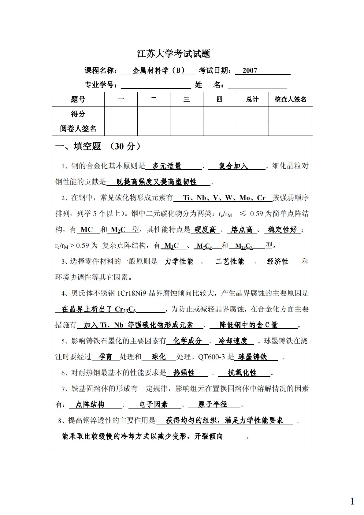 江苏大学考试试题课程名称:金属材料学(B)考试日期:2007专业学号:姓名:题号一二三四总计核查人签名得分阅卷人签名一、填空题(30分)1、钢的合金化基本原则是多元适量、复合加入。细化晶粒对钢性能的贡献是既提高强度又提高塑韧性。2、在钢中,常见碳化物形成元素有Ti、Nb、V、W、Mo、Cr按强弱顺序排列,列举5个以上)。钢中二元碳化物分为两类:rc/rM≤0.59为简单点阵结构,有MC和M2C型,其性能特点是硬度高、熔点高、稳定性好;rc/rM>0.59为复杂点阵结构,有M3C、M7C3和M23C7型。3、选择零件材料的一般原则是力学性能、工艺性能、经济性和环境协调性等其它因素。4、奥氏体不锈...