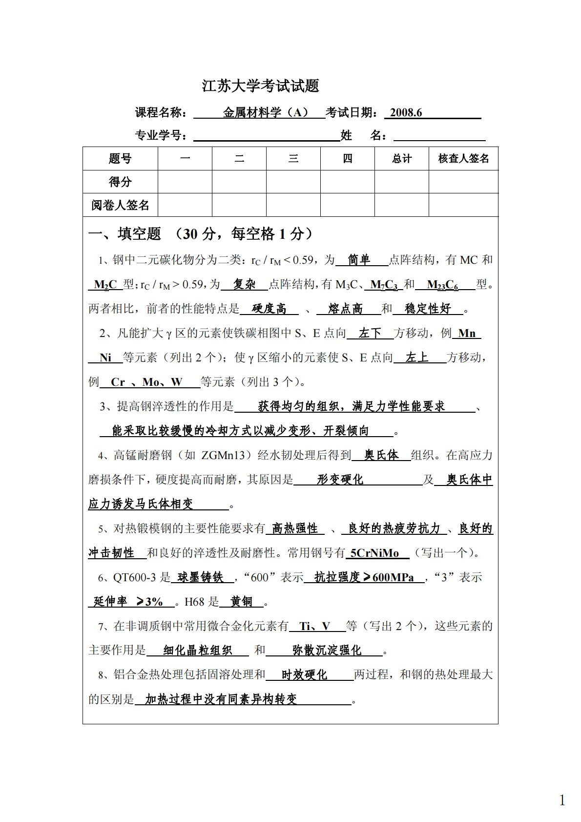 课程名称:金属材料学(A)江苏大学考试试题考试日期:2008.6专业学号:姓名:题号一二三四总计核查人签名得分阅卷人签名一、填空题(30分,每空格1分)1、钢中二元碳化物分为二类:rC/rM<0.59,为简单点阵结构,有MC和M2C型;rC/rM>0.59,为复杂点阵结构,有M3C、M7C3和M23C6型。两者相比,前者的性能特点是硬度高、熔点高和稳定性好。2、凡能扩大γ区的元素使铁碳相图中S、E点向左下方移动,例MnNi等元素(列出2个);使γ区缩小的元素使S、E点向左上方移动,例Cr、Mo、W等元素(列出3个)。3、提高钢淬透性的作用是获得均匀的组织,满足力学性能要求、能采取比较缓慢的冷却...