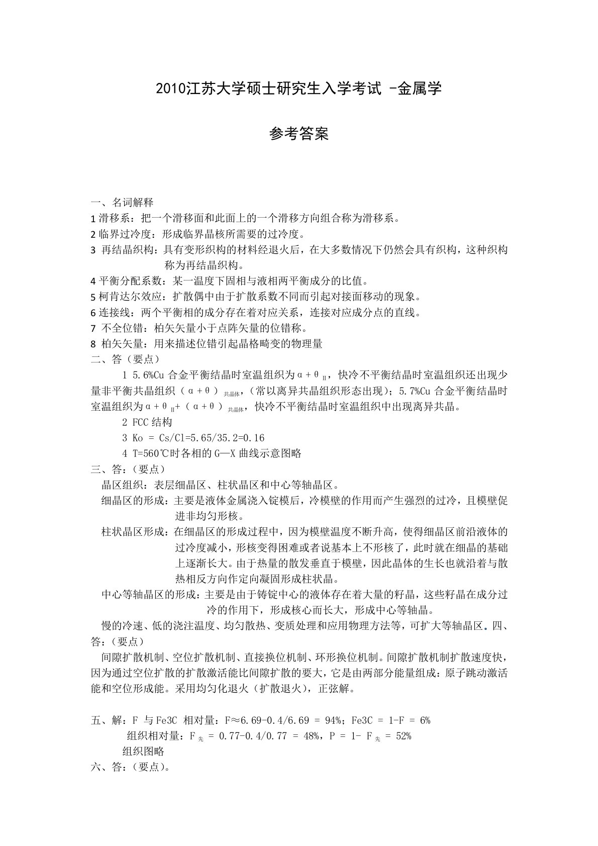2010江苏大学硕士研究生入学考试-金属学参考答案名词解释1滑移系:把一个滑移面和此面上的一个滑移方向组合称为滑移系。2临界过冷度:形成临界晶核所需要的过冷度。3再结晶织构:具有变形织构的材料经退火后,在大多数情况下仍然会具有织构,这种织构称为再结晶织构。4平衡分配系数:某一温度下固相与液相两平衡成分的比值。5柯肯达尔效应:扩散偶中由于扩散系数不同而引起对接面移动的现象。6连接线:两个平衡相的成分存在着对应关系,连接对应成分点的直线。7不全位错:柏矢矢量小于点阵矢量的位错称。8柏矢矢量:用来描述位错引起晶格畸变的物理量二、答(要点)15.6%Cu合金平衡结晶时室温组织为α+θⅡ,快冷不平衡结晶...
