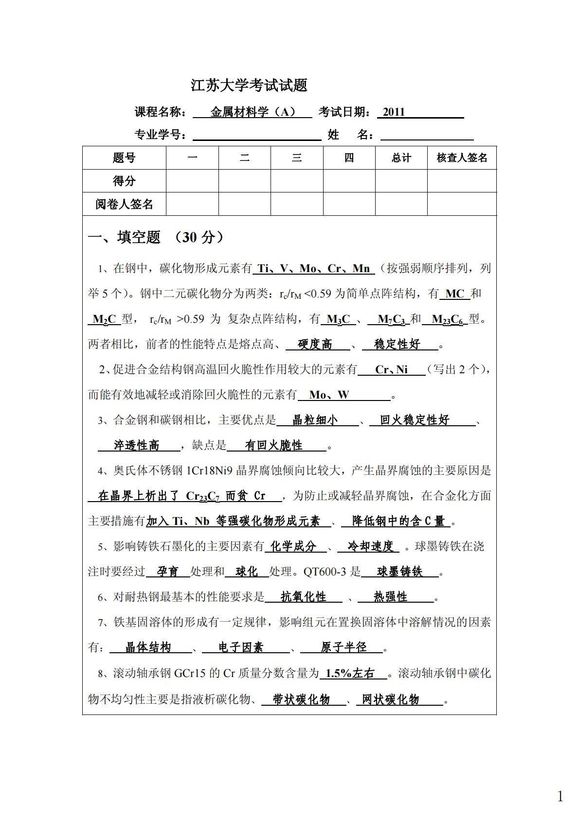 江苏大学考试试题课程名称:金属材料学(A)考试日期:2011专业学号:姓名:题号一二三四总计核查人签名得分阅卷人签名一、填空题(30分)1、在钢中,碳化物形成元素有Ti、V、Mo、Cr、Mn(按强弱顺序排列,列举5个)。钢中二元碳化物分为两类:rc/rM0.59为复杂点阵结构,有M3C、M7C3和M23C6型。两者相比,前者的性能特点是熔点高、硬度高、稳定性好。2、促进合金结构钢高温回火脆性作用较大的元素有Cr、Ni(写出2个),而能有效地减轻或消除回火脆性的元素有Mo、W。3、合金钢和碳钢相比,主要优点是晶粒细小、回火稳定性好、淬透性高,缺点是有回火脆性。4、奥氏体不锈钢1Cr18Ni9晶界...