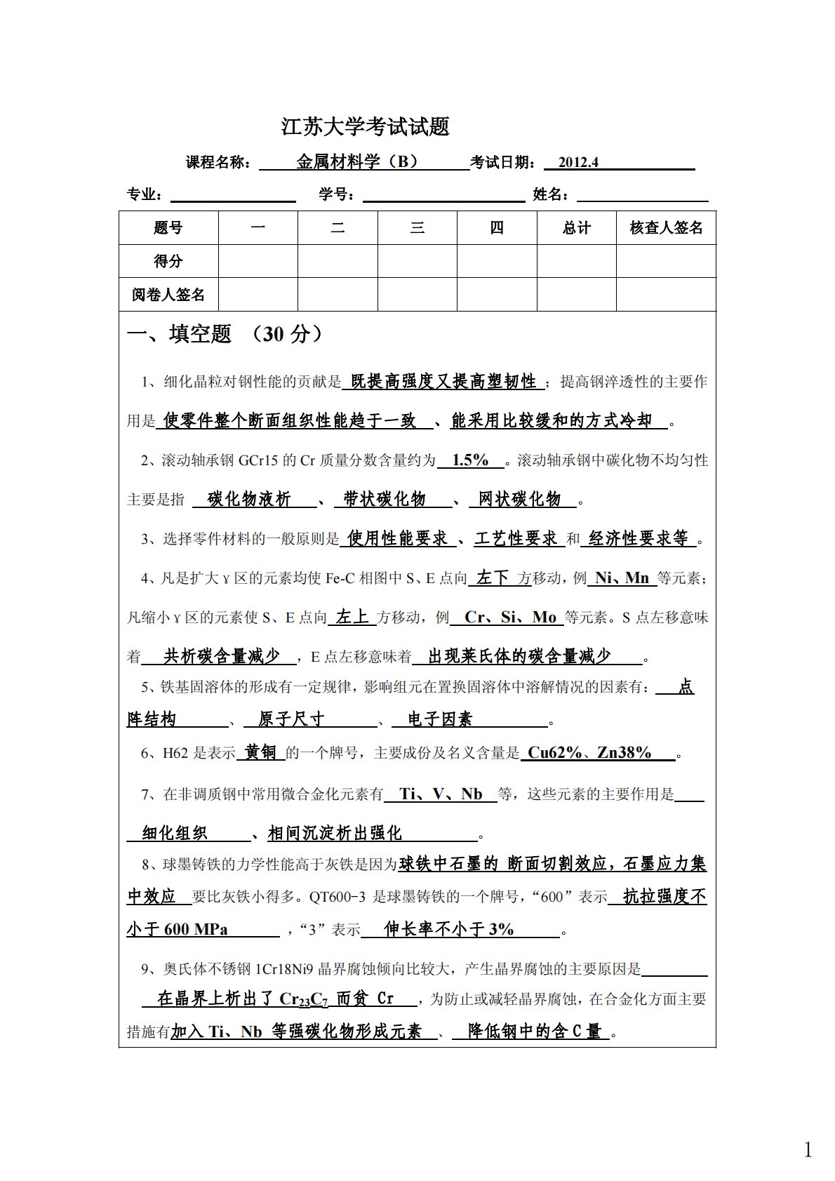 江苏大学考试试题课程名称:金属材料学(B)考试日期:2012.4专业:学号:姓名:题号一二三四总计核查人签名得分阅卷人签名一、填空题(30分)1、细化晶粒对钢性能的贡献是既提高强度又提高塑韧性;提高钢淬透性的主要作用是使零件整个断面组织性能趋于一致、能采用比较缓和的方式冷却。2、滚动轴承钢GCr15的Cr质量分数含量约为1.5%。滚动轴承钢中碳化物不均匀性主要是指碳化物液析、带状碳化物、网状碳化物。3、选择零件材料的一般原则是使用性能要求、工艺性要求和经济性要求等。4、凡是扩大γ区的元素均使Fe-C相图中S、E点向左下方移动,例Ni、Mn等元素;凡缩小γ区的元素使S、E点向左上方移动,例Cr、...