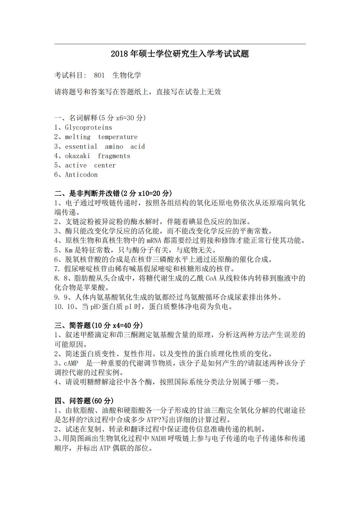 2018年硕士学位研究生入学考试试题考试科目:801生物化学请将题号和答案写在答题纸上,直接写在试卷上无效一、名词解释(5分x6=30分)1、Glycoproteins2、meltingtemperature3、essentialaminoacid4、okazakifragments5、activecenter6、Anticodon二、是非判断并改错(2分x10=20分)1、电子通过呼吸链传递时,按照各组结构的氧化还原电势依次从还原端向氧化端传递。2、支链淀粉被异淀粉的酶水解时,伴随着碘显色反应的加深。3、酶只能改变化学反应的活化能,而不能改变化学反应的平衡常数。4、原核生物和真核生物中的mR...
