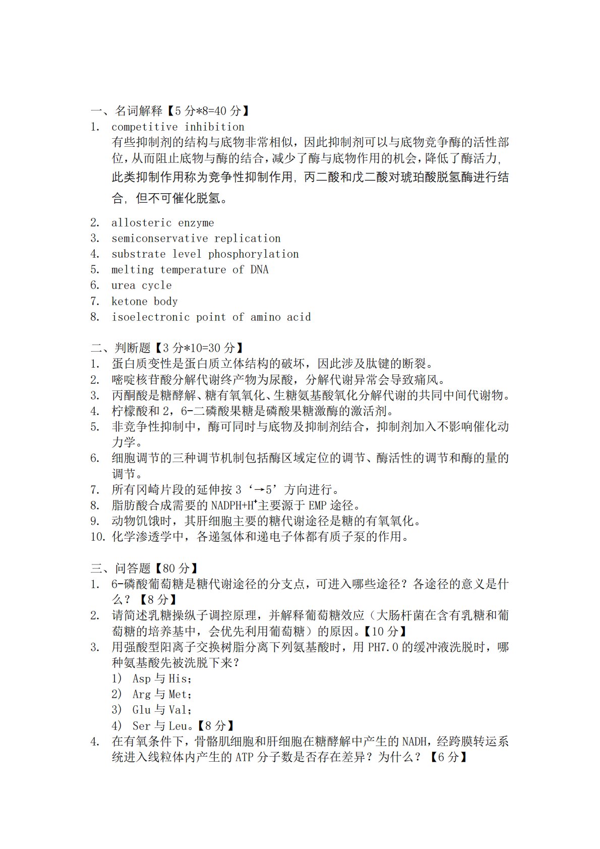 一、名词解释【5分*8=40分】1.competitiveinhibition有些抑制剂的结构与底物非常相似,因此抑制剂可以与底物竞争酶的活性部位,从而阻止底物与酶的结合,减少了酶与底物作用的机会,降低了酶活力,此类抑制作用称为竞争性抑制作用,丙二酸和戊二酸对琥珀酸脱氢酶进行结合,但不可催化脱氢。2.allostericenzyme3.semiconservativereplication4.substratelevelphosphorylation5.meltingtemperatureofDNA6.ureacycle7.ketonebody8.isoelectronicpointofami...