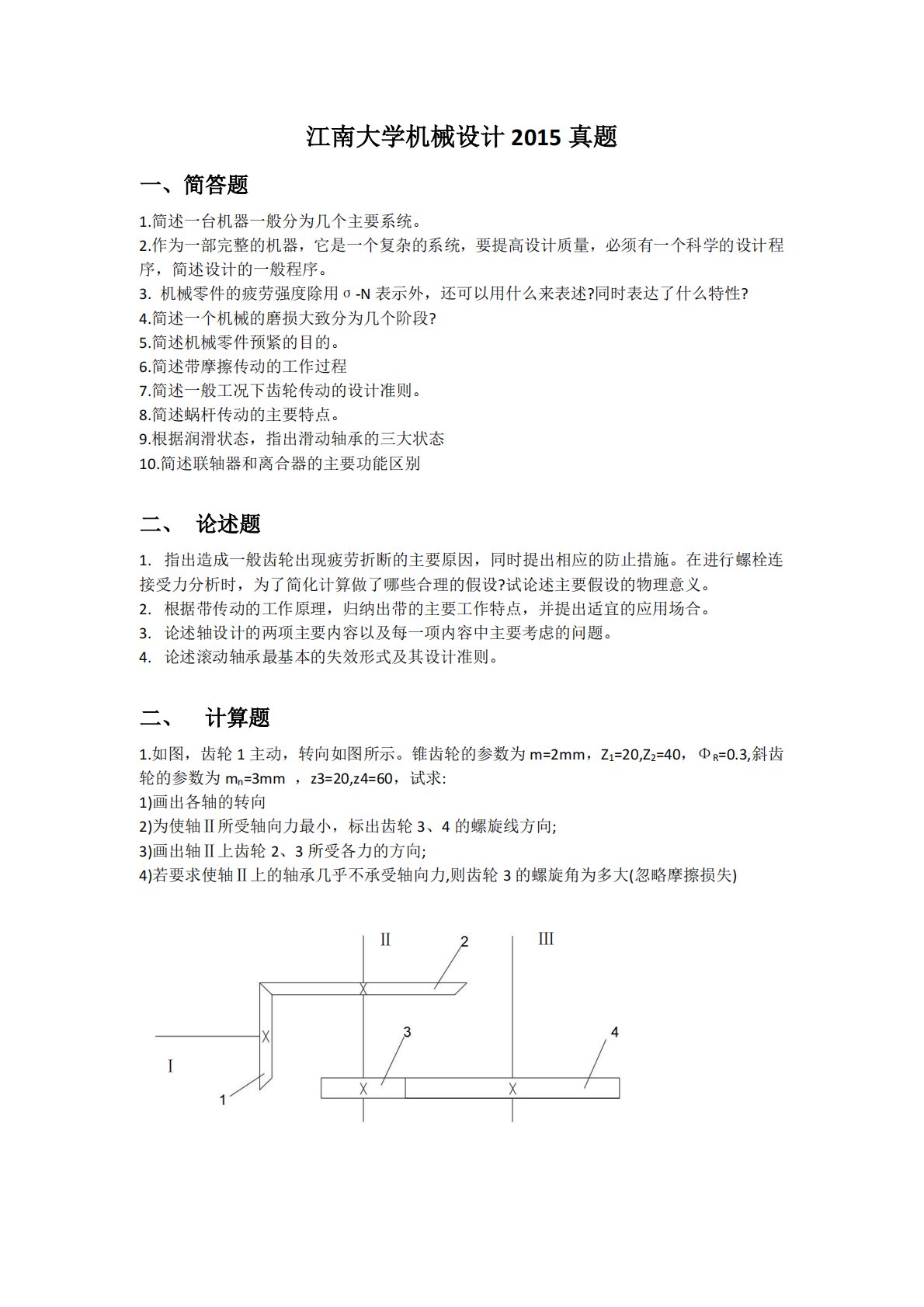 江南大学机械设计2015真题一、简答题1.简述一台机器一般分为几个主要系统。2.作为一部完整的机器,它是一个复杂的系统,要提高设计质量,必须有一个科学的设计程序,简述设计的一般程序。3.机械零件的疲劳强度除用σ-N表示外,还可以用什么来表述?同时表达了什么特性?4.简述一个机械的磨损大致分为几个阶段?5.简述机械零件预紧的目的。6.简述带摩擦传动的工作过程7.简述一般工况下齿轮传动的设计准则。8.简述蜗杆传动的主要特点。9.根据润滑状态,指出滑动轴承的三大状态10.简述联轴器和离合器的主要功能区别二、论述题1.指出造成一般齿轮出现疲劳折断的主要原因,同时提出相应的防止措施。在进行螺栓连接受力分...