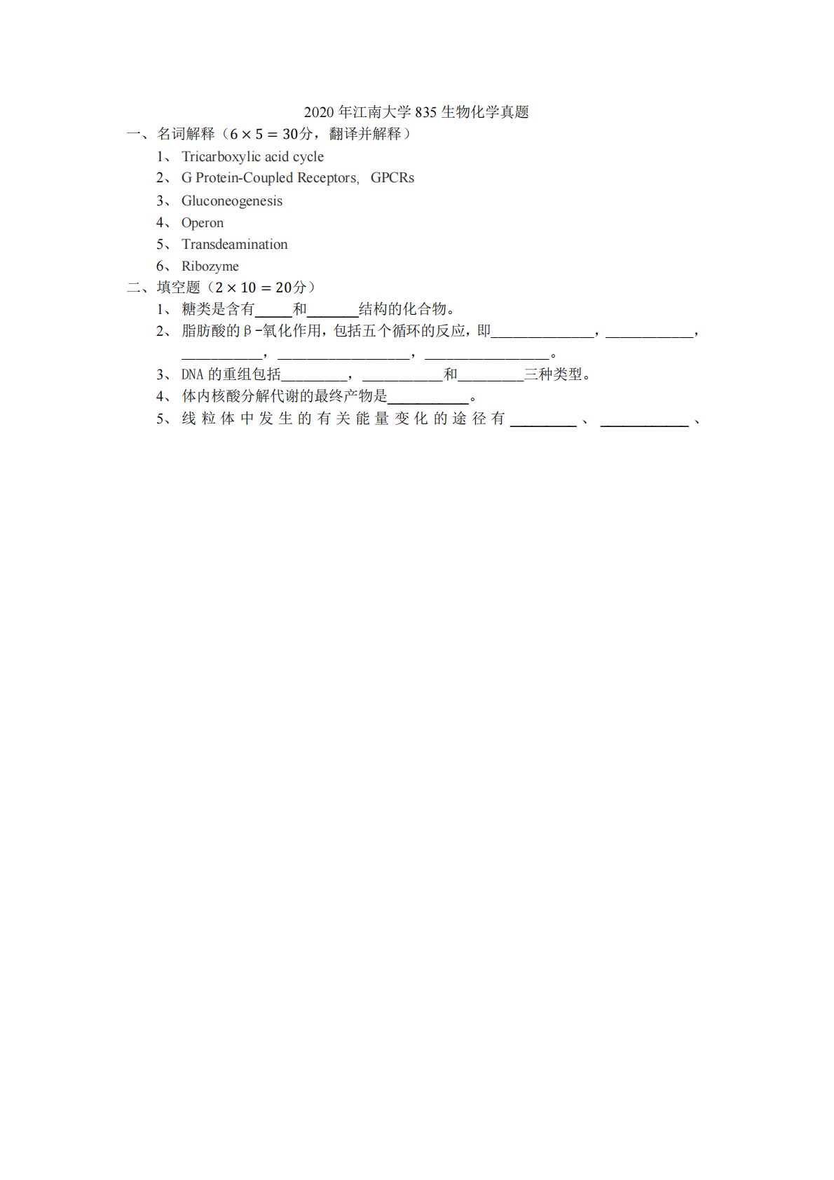 2020年江南大学835生物化学真题一、名词解释(6×5=30分,翻译并解释)1、Tricarboxylicacidcycle2、GProtein-CoupledReceptors,GPCRs3、Gluconeogenesis4、Operon5、Transdeamination6、Ribozyme二、填空题(2×10=20分)1、糖类是含有_____和_______结构的化合物。2、脂肪酸的β-氧化作用,包括五个循环的反应,即______________,____________,___________,__________________,_________________。3、DNA的重组...