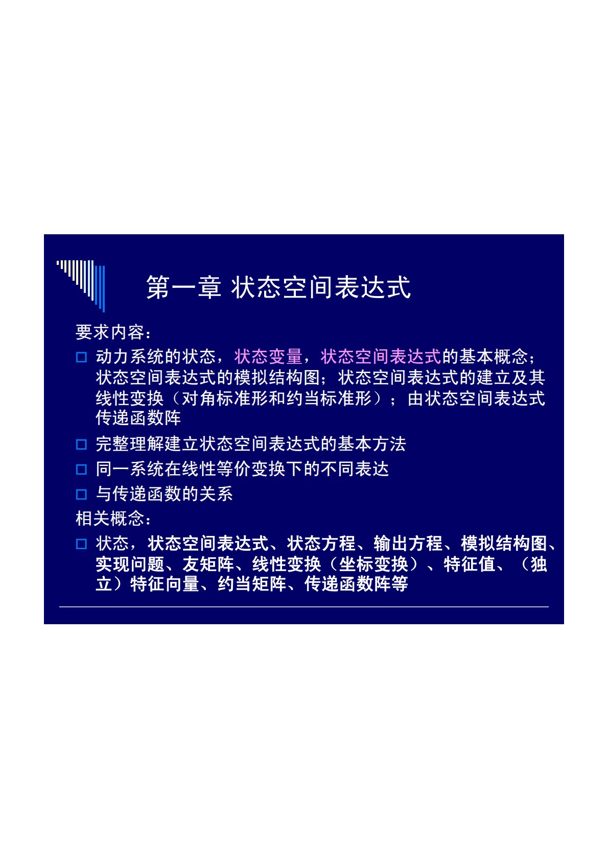 第一章状态空间表达式要求内容:†动力系统的状态,状态变量,状态空间表达式的基本概念;状态空间表达式的模拟结构图;状态空间表达式的建立及其线性变换(对角标准形和约当标准形);由状态空间表达式传递函数阵†完整理解建立状态空间表达式的基本方法†同一系统在线性等价变换下的不同表达†与传递函数的关系相关概念:†状态,状态空间表达式、状态方程、输出方程、模拟结构图、实现问题、友矩阵、线性变换(坐标变换)、特征值、(独立)特征向量、约当矩阵、传递函数阵等第一章复习要点1.建立连续时间系统的状态空间表达式„系统结构图建立‡转化为有积分号的模拟图,取状态变量,根据变量关系写出一阶微分方程组,状态空间表达式„系统...