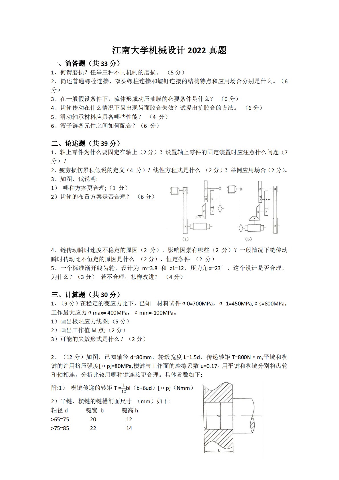 江南大学机械设计2022真题一、简答题(共33分)1、何谓磨损?任举三种不同机制的磨损。(5分)2、简述普通螺栓连接、双头螺柱连接和螺钉连接的结构特点和应用场合分别是什么。(6分)3、在一般假设条件下,流体形成动压油膜的必要条件是什么?(6分)4、齿轮传动在什么情况下易出现齿面胶合失效?试提出抗胶合的方法。(6分)5、滑动轴承材料应具备哪些性能?(4分)6、滚子链各元件之间如何配合?(6分)二、论述题(共39分)1、轴上零件为什么要固定在轴上(2分)?设置轴上零件的固定装置时应注意什么问题(7分)?2、疲劳损伤累积假说的定义(4分)?线性方程式是什么(2分)?举例应用场合(2分)。3、如图,试...