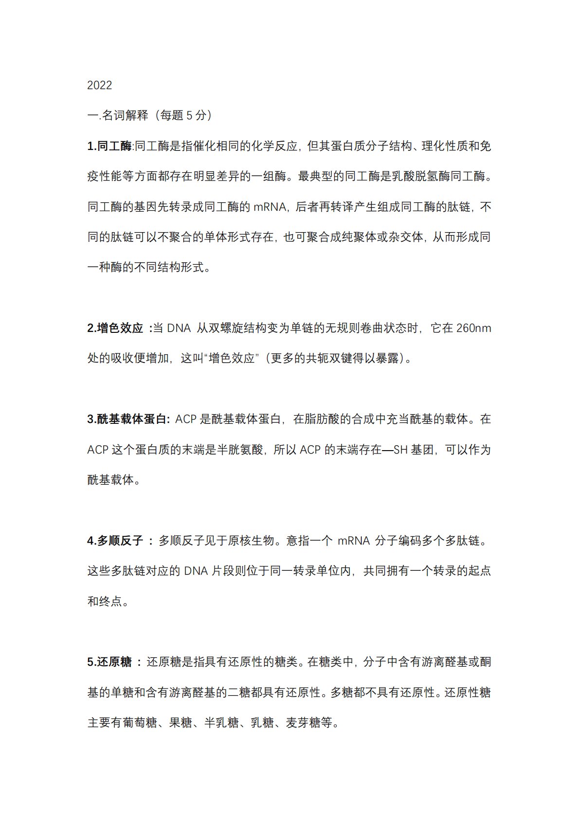 2022一.名词解释(每题5分)1.同工酶:同工酶是指催化相同的化学反应,但其蛋白质分子结构、理化性质和免疫性能等方面都存在明显差异的一组酶。最典型的同工酶是乳酸脱氢酶同工酶。同工酶的基因先转录成同工酶的mRNA,后者再转译产生组成同工酶的肽链,不同的肽链可以不聚合的单体形式存在,也可聚合成纯聚体或杂交体,从而形成同一种酶的不同结构形式。2.增色效应:当DNA从双螺旋结构变为单链的无规则卷曲状态时,它在260nm处的吸收便增加,这叫“增色效应”(更多的共轭双键得以暴露)。3.酰基载体蛋白:ACP是酰基载体蛋白,在脂肪酸的合成中充当酰基的载体。在ACP这个蛋白质的末端是半胱氨酸,所以ACP的末端...