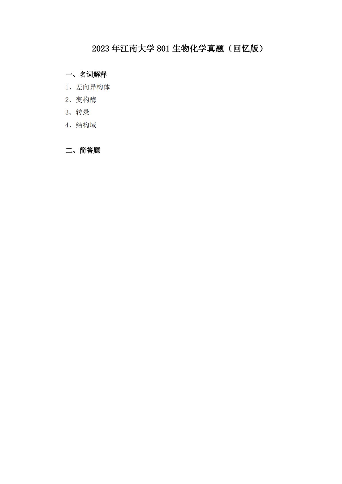 江南大学801生物化学2023年真题回忆版