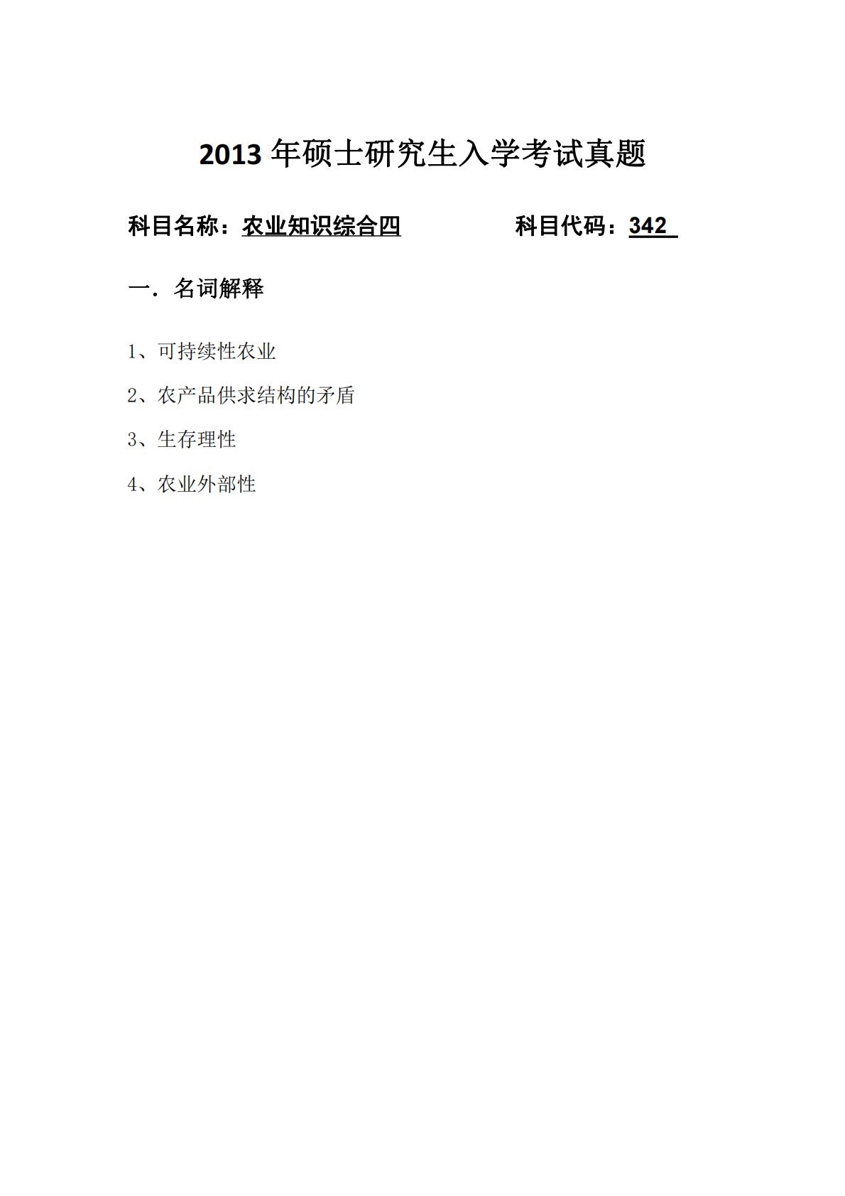 2013年硕士研究生入学考试真题科目名称:农业知识综合四科目代码:342一.名词解释1、可持续性农业2、农产品供求结构的矛盾3、生存理性4、农业外部性2013年硕士研究生入学考试真题科目名称:农业知识综合四科目代码:342一.名词解释1、可持续性农业2、农产品供求结构的矛盾3、生存理性4、农业外部性5、城镇化6、村民自治二、简答题1、简述农业产业结构优化的原则2、怎么样建立健全完善农村基层民主制度3、传统农村社会家庭的功能4、目国农业政策面临的问题与缺陷三、论述题1、结合实际论述农村人口问题的成因及其对策2、论述农业政策执行的影响因素百校文库—海量高校资料共享库百校文库是一个线上大学生专业学习...