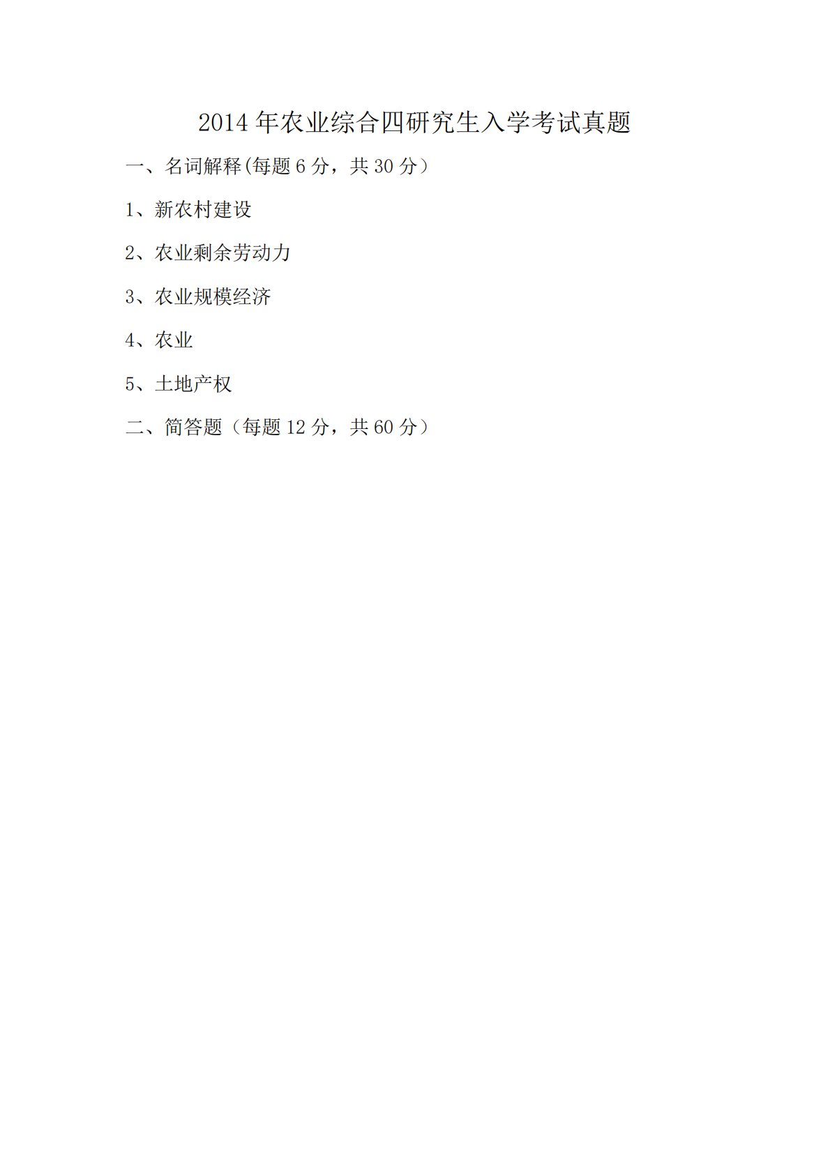 2014年农业综合四研究生入学考试真题一、名词解释(每题6分,共30分)1、新农村建设2、农业剩余劳动力3、农业规模经济4、农业5、土地产权二、简答题(每题12分,共60分)2014年农业综合四研究生入学考试真题一、名词解释(每题6分,共30分)1、新农村建设2、农业剩余劳动力3、农业规模经济4、农业5、土地产权二、简答题(每题12分,共60分)1、简述我国实行农业集约经营的重要意义2、简述农业现代化的内容3、简述农产品批发市场的功能4、简述农业家庭经营广泛存在的原因5、简述新型农村合作医疗制度三、论述题(每题30分,共60分)1、试论述农产品期货市场的功能与作用2、试论述你对社会保障、社会保...