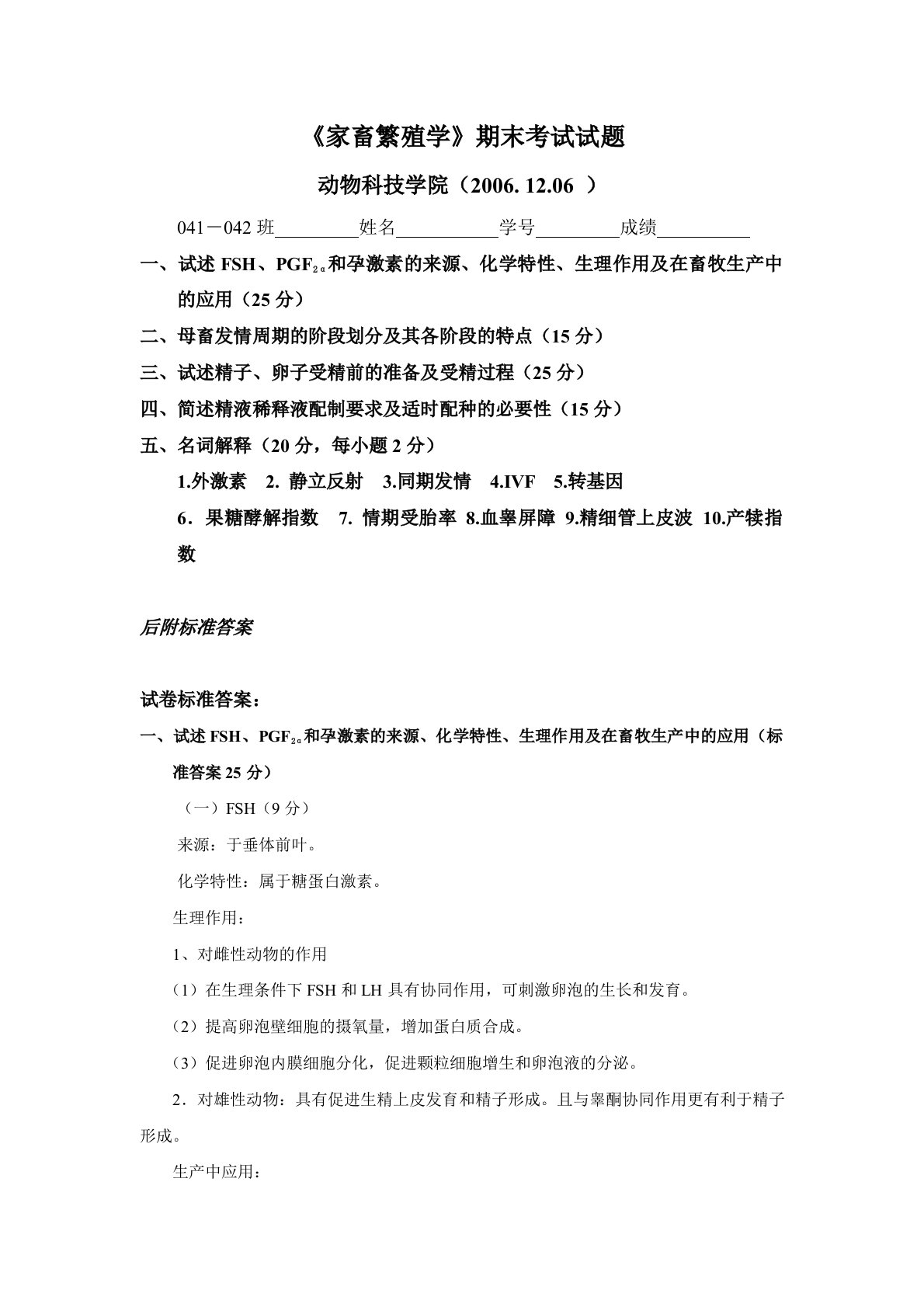 江西农业大学340农业知识综合二2006年家畜繁殖学试卷A及参考答案(动物繁殖学).doc