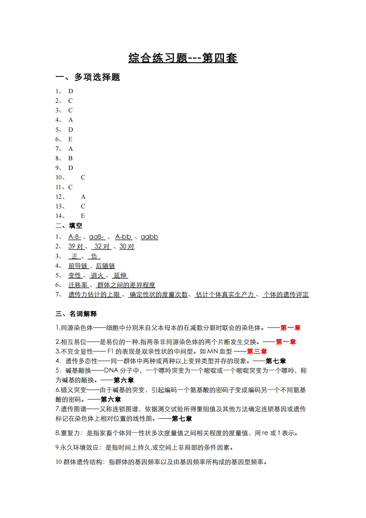 综合练习题---第四套一、多项选择题1、D2、C3、C4、A5、D6、E7、A8、B9、D10、C11、C12、A13、C14、E二、填空1、A-B-、aaB-、A-bb、aabb2、39对、32对、30对3、正、负4、前导链,后随链5、变性、退火、延伸6、迁移率、群体之间的差异程度7、遗传力估计的上限、确定性状的度量次数、估计个体真实生产力、个体的遗传评定三、名词解释1.同源染色体——细胞中分别来自父本母本的在减数分裂时联会的染色体。——第一章2.相互易位——是易位的一种,指两条非同源染色体的两个片断发生交换。——第一章3.不完全显性——F1的表现是双亲性状的中间型。如MN血型——第三章4....