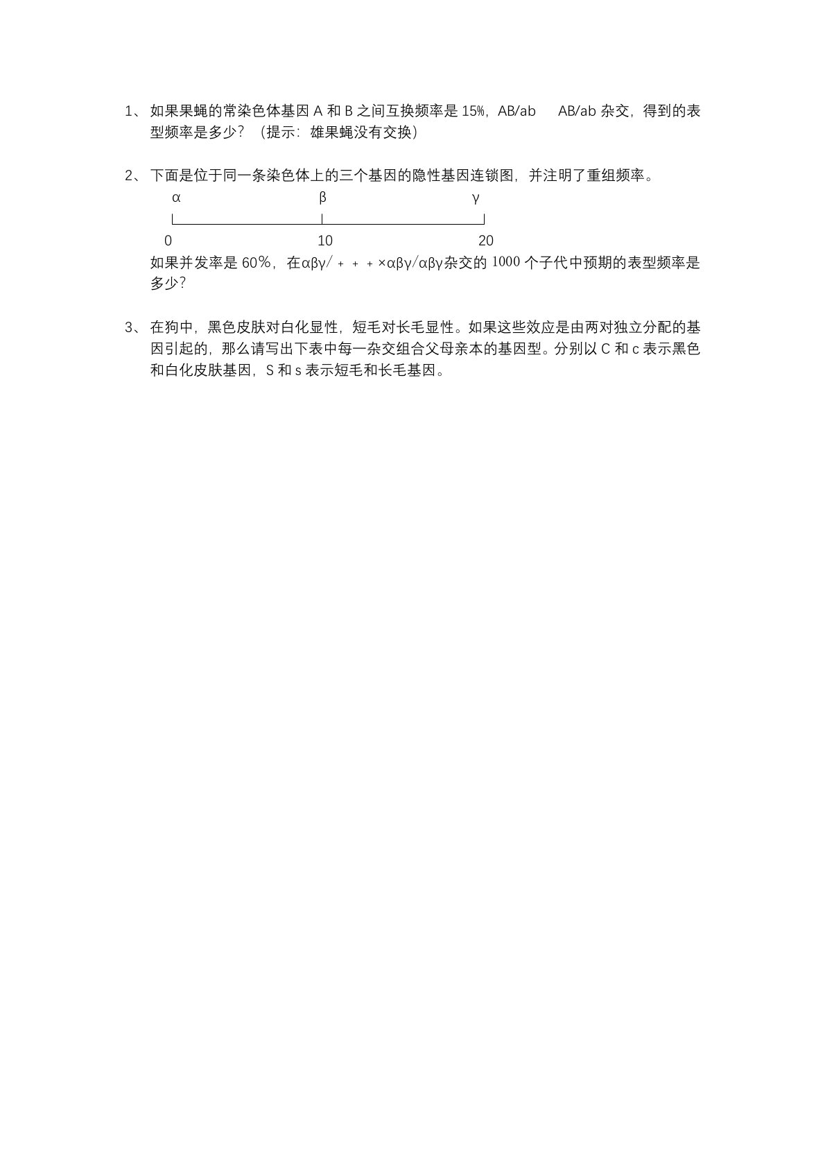 如果果蝇的常染色体基因A和B之间互换频率是15%,AB/abAB/ab杂交,得到的表型频率是多少?(提示:雄果蝇没有交换)下面是位于同一条染色体上的三个基因的隐性基因连锁图,并注明了重组频率。αβγ01020如果并发率是60%,在αβγ/﹢﹢﹢×αβγ/αβγ杂交的1000个子代中预期的表型频率是多少?在狗中,黑色皮肤对白化显性,短毛对长毛显性。如果这些效应是由两对独立分配的基因引起的,那么请写出下表中每一杂交组合父母亲本的基因型。分别以C和c表示黑色和白化皮肤基因,S和s表示短毛和长毛基因。如果果蝇的常染色体基因A和B之间互换频率是15%,AB/abAB/ab杂交,得到的表型频率是多少?...