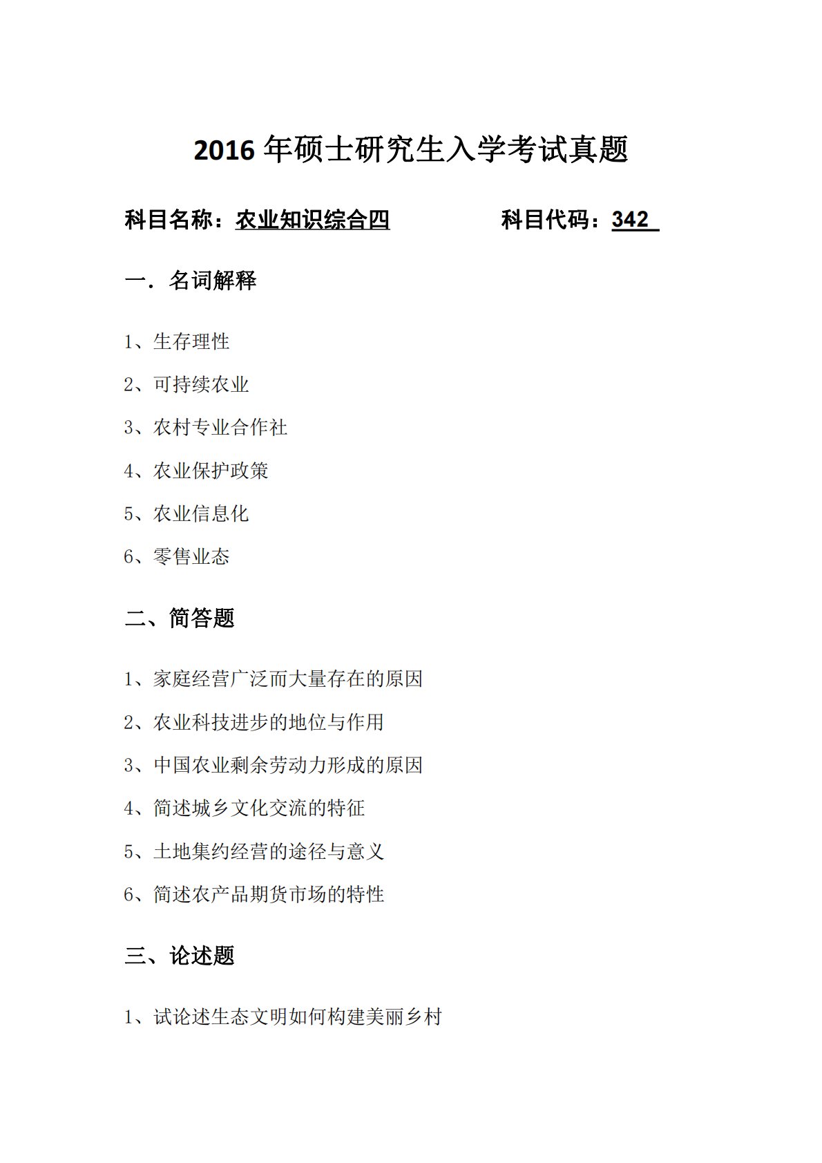 2016年硕士研究生入学考试真题科目名称:农业知识综合四科目代码:342一.名词解释1、生存理性2、可持续农业3、农村专业合作社4、农业保护政策5、农业信息化6、零售业态二、简答题1、家庭经营广泛而大量存在的原因2、农业科技进步的地位与作用3、中国农业剩余劳动力形成的原因4、简述城乡文化交流的特征5、土地集约经营的途径与意义6、简述农产品期货市场的特性三、论述题1、试论述生态文明如何构建美丽乡村2、结合我国农村扶贫的历史经验和存在的问题分析我国今后农村扶贫的发展方向百校文库—海量高校资料共享库百校文库是一个线上大学生专业学习资料共享平台,致力于通过用户自主上传与分享,打造一个涵盖各大高校、各学...