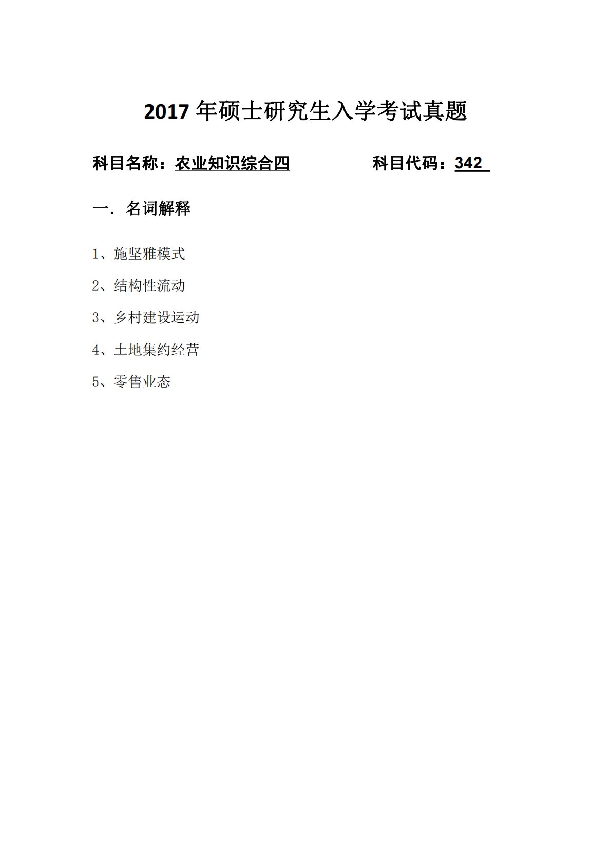 2017年硕士研究生入学考试真题科目名称:农业知识综合四科目代码:342一.名词解释1、施坚雅模式2、结构性流动3、乡村建设运动4、土地集约经营5、零售业态2017年硕士研究生入学考试真题科目名称:农业知识综合四科目代码:342一.名词解释1、施坚雅模式2、结构性流动3、乡村建设运动4、土地集约经营5、零售业态6、农产品期货市场二、简答题1、简述新农村建设的意义2、中国民间信仰的特征3、简述农业家庭承包的障碍4、中国生态农业的特征三、论述题1、论述费孝通的小城镇建设2、论述新时期我国农村土地“三权分置”背景、意义、改革措施百校文库—海量高校资料共享库百校文库是一个线上大学生专业学习资料共享平台...
