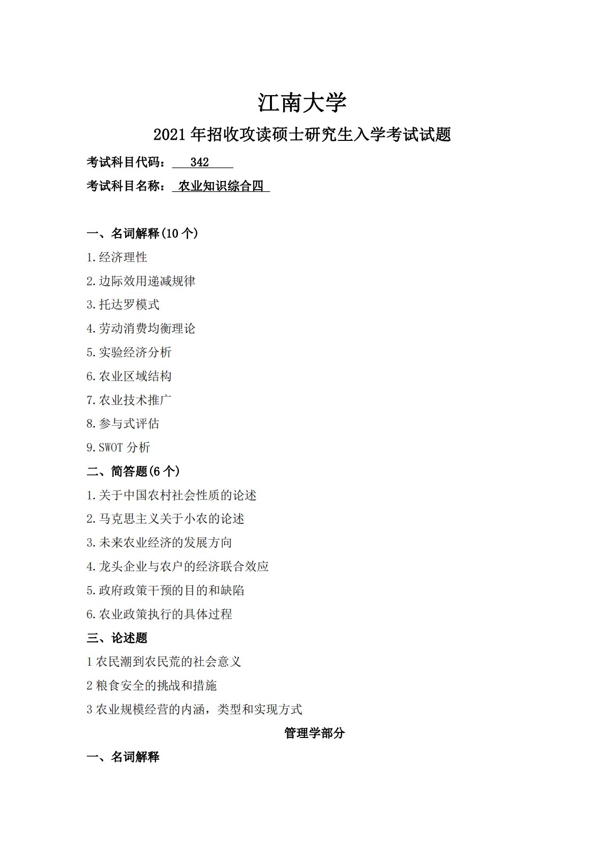 江南大学2021年招收攻读硕士研究生入学考试试题考试科目代码:342考试科目名称:农业知识综合四一、名词解释(10个)1.经济理性2.边际效用递减规律3.托达罗模式4.劳动消费均衡理论5.实验经济分析6.农业区域结构7.农业技术推广8.参与式评估9.SWOT分析二、简答题(6个)1.关于中国农村社会性质的论述2.马克思主义关于小农的论述3.未来农业经济的发展方向4.龙头企业与农户的经济联合效应5.政府政策干预的目的和缺陷6.农业政策执行的具体过程三、论述题1农民潮到农民荒的社会意义2粮食安全的挑战和措施3农业规模经营的内涵,类型和实现方式管理学部分一、名词解释1.方法论2.准实验法3.内容分析...