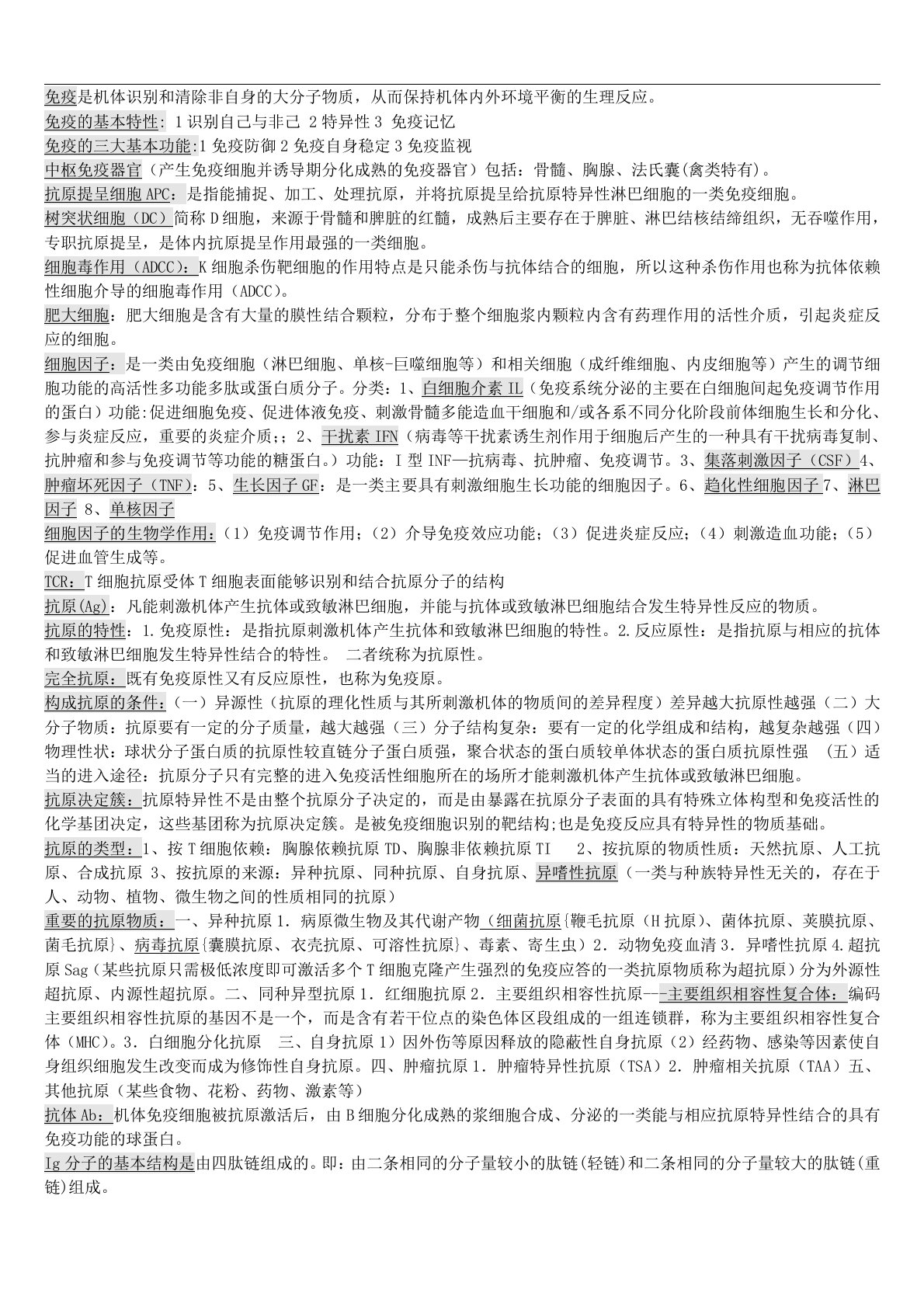 免疫是机体识别和清除非自身的大分子物质,从而保持机体内外环境平衡的生理反应。免疫的基本特性:1识别自己与非己2特异性3免疫记忆免疫的三大基本功能:1免疫防御2免疫自身稳定3免疫监视中枢免疫器官(产生免疫细胞并诱导期分化成熟的免疫器官)包括:骨髓、胸腺、法氏囊(禽类特有)。抗原提呈细胞APC:是指能捕捉、加工、处理抗原,并将抗原提呈给抗原特异性淋巴细胞的一类免疫细胞。树突状细胞(DC)简称D细胞,来源于骨髓和脾脏的红髓,成熟后主要存在于脾脏、淋巴结核结缔组织,无吞噬作用,专职抗原提呈,是体内抗原提呈作用最强的一类细胞。细胞毒作用(ADCC):K细胞杀伤靶细胞的作用特点是只能杀伤与抗体结合的细胞,...