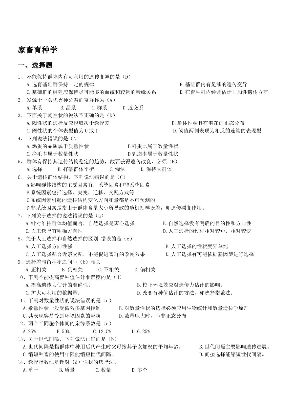 家畜育种学一、选择题不能保持群体内有可利用的遗传变异的是(D)A.选育基础群保持一定的规律B.基础群内有足够的遗传变异C.基础群的组建应保持尽可能多的血统和较远的亲缘关系D.在育种群内经常估计非加性遗传方差发源于一头优秀种公畜的畜群称为(A)A.单系B.品系C.群系D.近交系下面关于阈性状的说法不正确的是(D)A.阈性状的选择反应也取决于选择差B.群体性状具有潜在的正态分布C.阈性状的个体表型值为0或1D.阈值两侧表现为相反的连续的表现型下列说法错误的是(A)A.鸡蛋的品质属于质量性状B料蛋比属于数量性状C.净毛率属于数量性状D乳脂率属于数量性状群体有保持其遗传结构稳定的趋势,故要获得遗传改良...