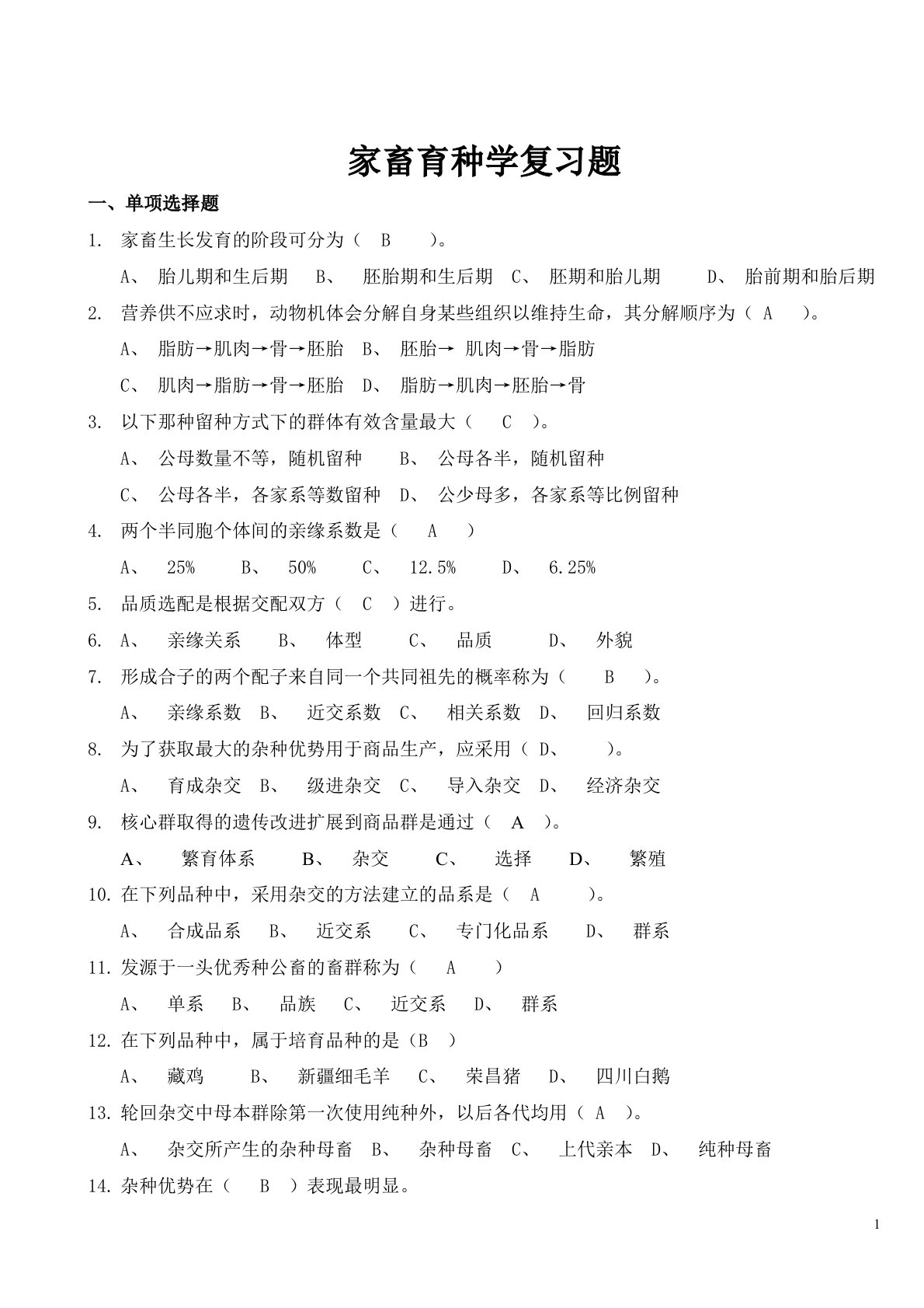 家畜育种学复习题一、单项选择题家畜生长发育的阶段可分为(B)。A、胎儿期和生后期B、胚胎期和生后期C、胚期和胎儿期D、胎前期和胎后期营养供不应求时,动物机体会分解自身某些组织以维持生命,其分解顺序为(A)。A、脂肪→肌肉→骨→胚胎B、胚胎→肌肉→骨→脂肪C、肌肉→脂肪→骨→胚胎D、脂肪→肌肉→胚胎→骨以下那种留种方式下的群体有效含量最大(C)。A、公母数量不等,随机留种B、公母各半,随机留种C、公母各半,各家系等数留种D、公少母多,各家系等比例留种两个半同胞个体间的亲缘系数是(A)A、25%B、50%C、12.5%D、6.25%品质选配是根据交配双方(C)进行。A、亲缘关系B、体型C、品质D、...