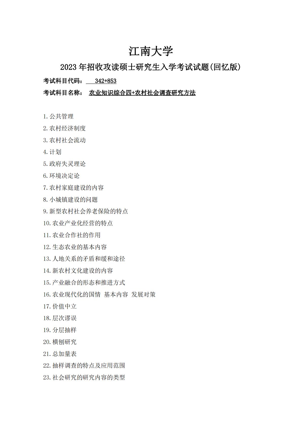 江南大学2023年招收攻读硕士研究生入学考试试题(回忆版)考试科目代码:342+8531.公共管理2.农村经济制度3.农村社会流动4.计划5.政府失灵理论6.环境决定论7.农村家庭建设的内容8.小城镇建设的问题9.新型农村社会养老保险的特点10.农业产业化经营的特点11.农业合作社的作用12.生态农业的基本内容13.人地关系的矛盾和缓和途径14.新农村文化建设的内容15.产业融合的形态和推进方式16.农业现代化的国情基本内容发展对策17.价值中立18.层次谬误19.分层抽样20.横刨研究21.总加量表22.抽样调查的特点及应用范围23.社会研究的研究内容的类考试科目名称:农业知识综合四+Å©´...