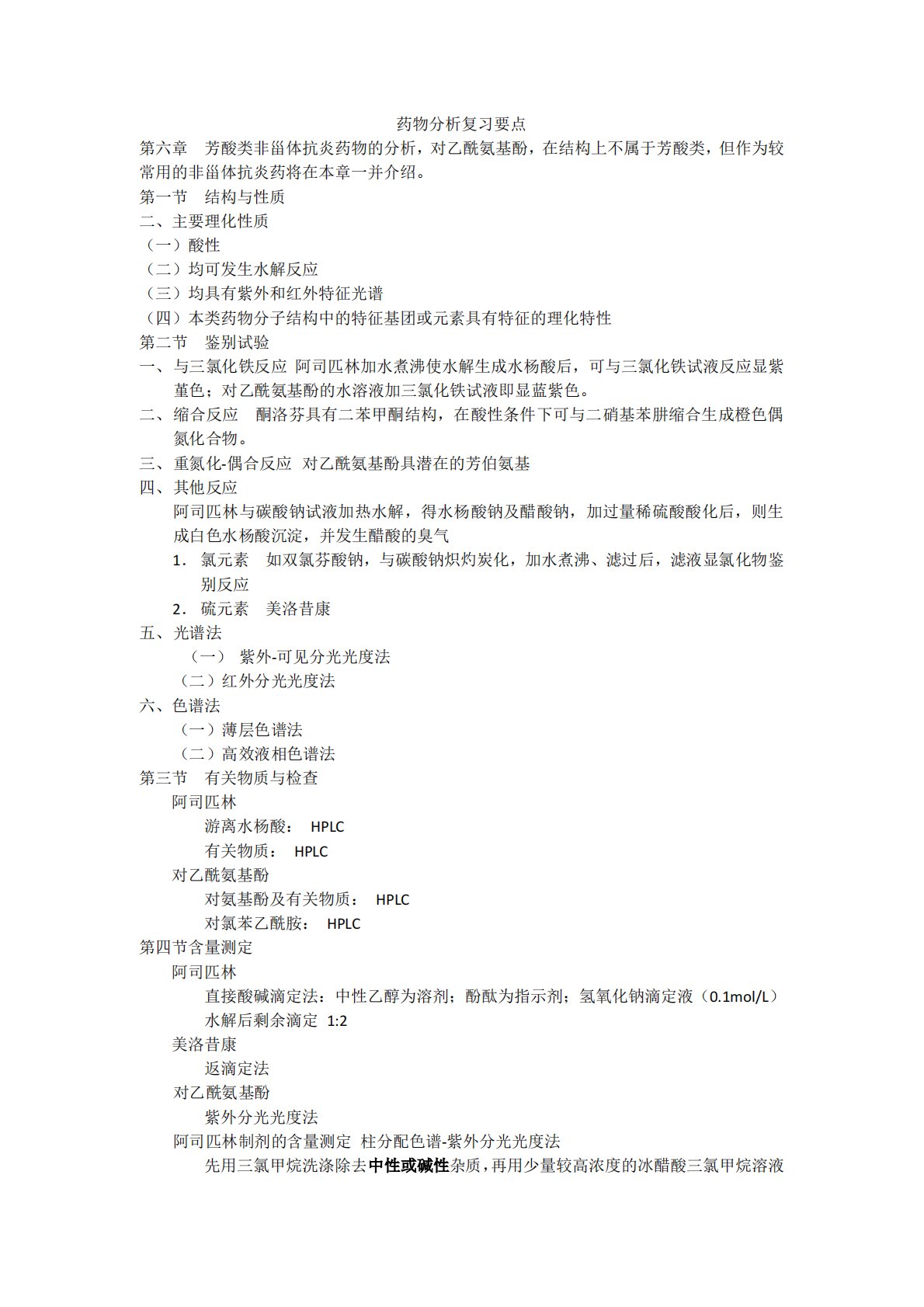 药物分析复习要点第六章芳酸类非甾体抗炎药物的分析,对乙酰氨基酚,在结构上不属于芳酸类,但作为较常用的非甾体抗炎药将在本章一并介绍。第一节结构与性质二、主要理化性质(一)酸性(二)均可发生水解反应(三)均具有紫外和红外特征光谱(四)本类药物分子结构中的特征基团或元素具有特征的理化特性第二节鉴别试验一、与三氯化铁反应阿司匹林加水煮沸使水解生成水杨酸后,可与三氯化铁试液反应显紫堇色;对乙酰氨基酚的水溶液加三氯化铁试液即显蓝紫色。二、缩合反应酮洛芬具有二苯甲酮结构,在酸性条件下可与二硝基苯肼缩合生成橙色偶氮化合物。三、重氮化-偶合反应对乙酰氨基酚具潜在的芳伯氨基四、其他反应阿司匹林与碳酸钠试液加热水解...