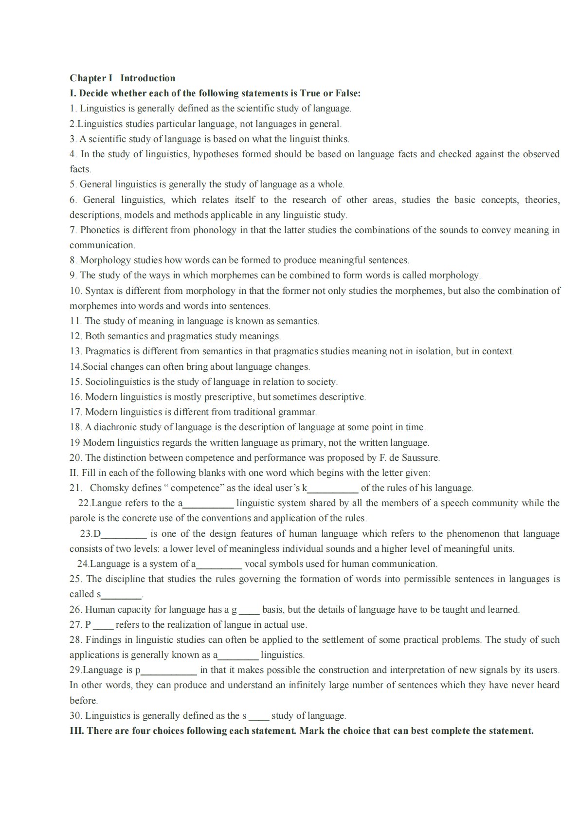 ChapterIIntroductionI.DecidewhethereachofthefollowingstatementsisTrueorFalse:1.Linguisticsisgenerallydefinedasthescientificstudyoflanguage.2.Linguisticsstudiesparticularlanguage,notlanguagesingeneral.3.Ascientificstudyoflanguageisbasedonwhatthelinguistthinks.4.Inthestudyoflinguistics,hypothesesforme...