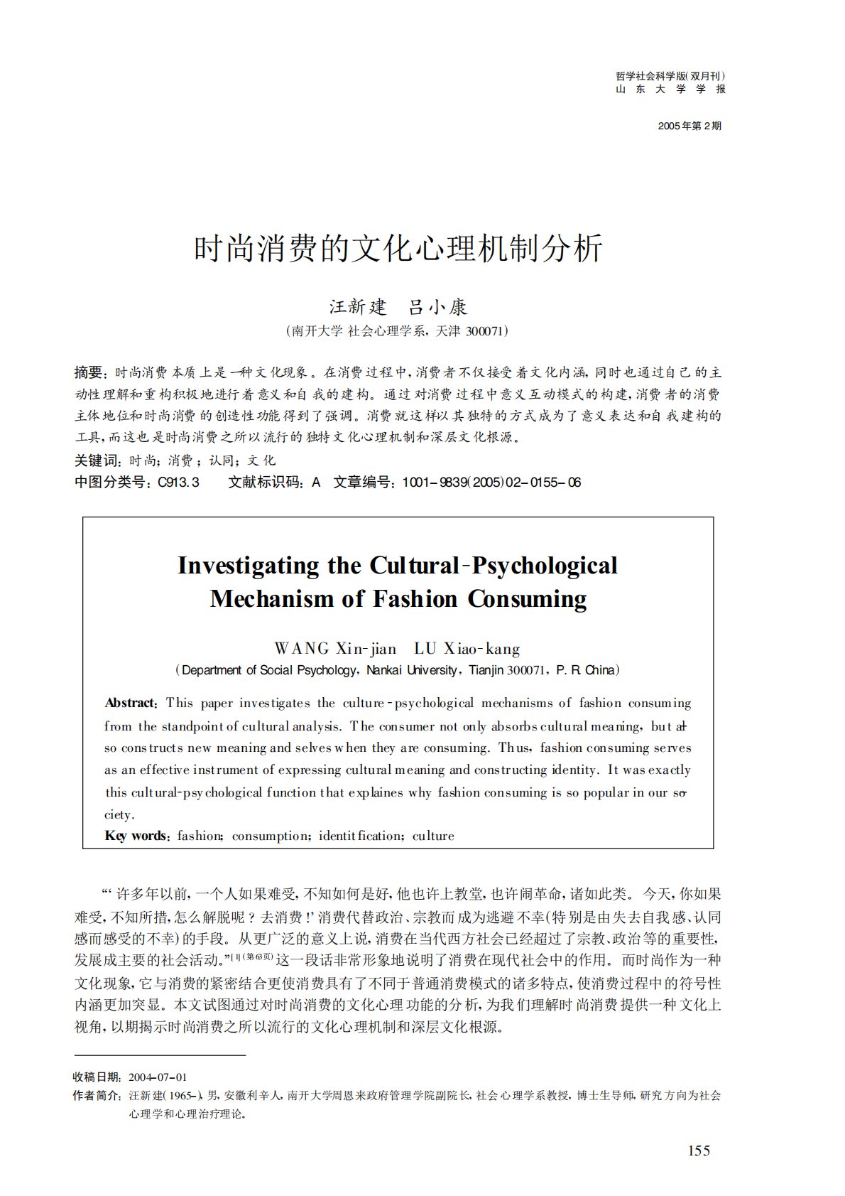 Hhn¥ÓÄ�ØÅs汪新建 吕小康(27vÐö�ØÐ",?Ã300071)K1:时尚消费本质上是一种文化现象。在消费过程中,消费者不仅接受着文化内涵,同时也通过自己的主动性理解和重构积极地进行着意义和自我的建构。通过对消费过程中意义互动模式的构建,消费者的消费主体地位和时尚消费的创造性功能得到了强调。消费就这样以其独特的方式成为了意义表达和自我建构的工具,而这也是时尚消费之所以流行的独特文化心理机制和深层文化根源。1oM:时尚;消费;认同;文化ÏmsË|:C913.3 ÓDSM’:A ÓcI|:1001-9839(20...