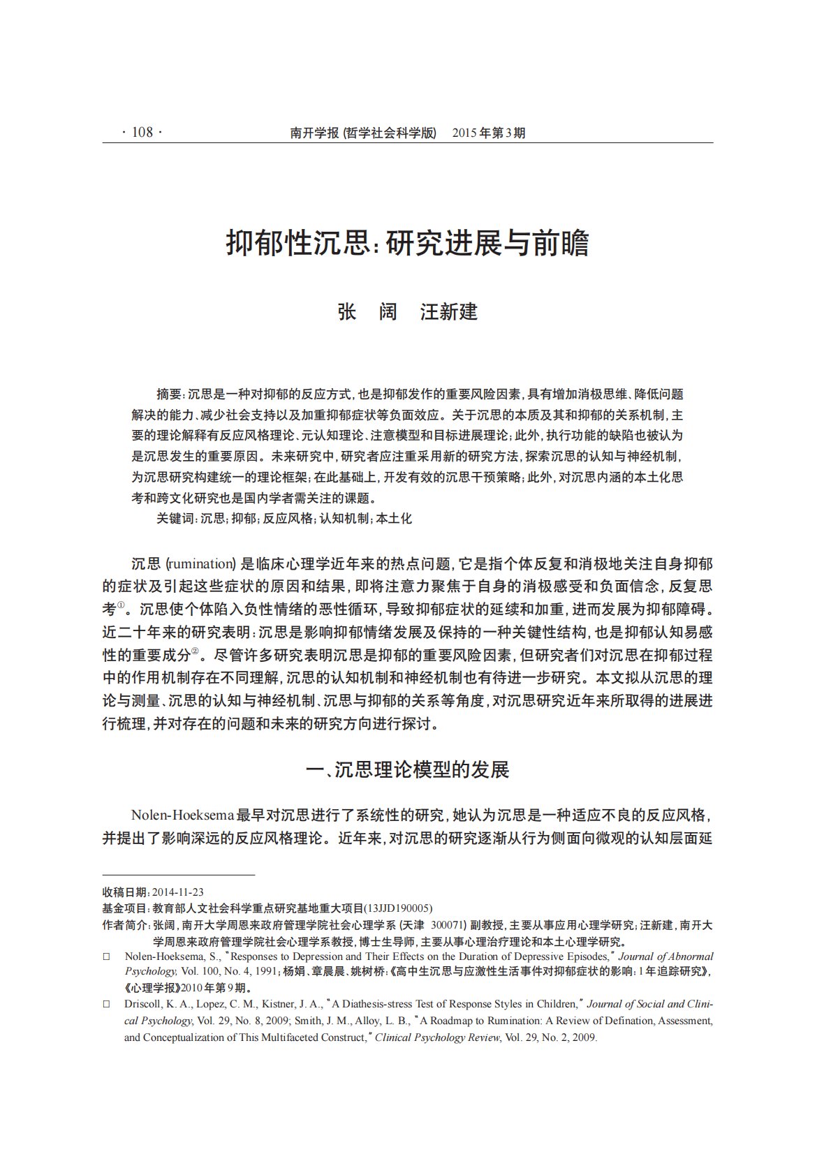 ¡¤108¡¤ÄÏ¿ªÑ§±¨£¨ÕÜѧÉç»á¿ÆÑ§°æ£©2015ÄêµÚ3ÆÚÒÖÓôÐÔ³Á˼£ºÑо¿½øÕ¹ÓëǰհÕÅÀ«Íôн¨ÕªÒª£º³Á˼ÊÇÒ»ÖÖ¶ÔÒÖÓôµÄ·´Ó¦·½Ê½£¬Ò²ÊÇÒÖÓô·¢×÷µÄÖØÒª·çÏÕÒòËØ£¬¾ßÓÐÔö¼ÓÏû¼«Ë¼Î¬¡¢½µµÍÎÊÌâ½â¾öµÄÄÜÁ¦¡¢¼õÉÙÉç»áÖ§³ÖÒÔ¼°¼ÓÖØÒÖÓôÖ¢×´µÈ¸ºÃæÐ§Ó¦¡£¹ØÓÚ³Á˼µÄ±¾Öʼ°ÆäºÍÒÖÓôµÄ¹ØÏµ»úÖÆ£¬Ö÷ÒªµÄÀíÂÛ½âÊÍÓз´Ó¦·ç¸ñÀíÂÛ¡¢ÔªÈÏÖªÀíÂÛ¡¢×¢...