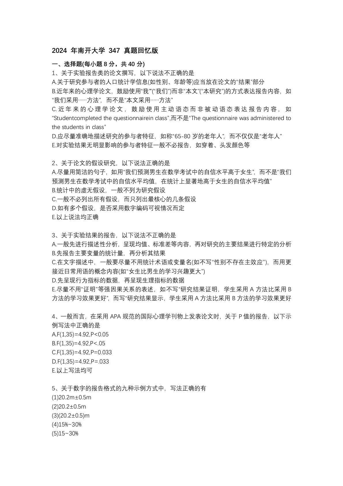 2024年南开大学347真题回忆版选择题(每小题8分,共40分)1、关于实验报告类的论文撰写,以下说法不正确的是A.关于研究参与者的人口统计学信息(如性别、年龄等)应当放在论文的“结果”部分B.近年来的心理学论文,鼓励使用“我””(“我们”)而非“本文”(“本研究”)的方式表达报告内容,如“我们采用……方法”,而不是“本文采用……方法”C.近年来的心理学论文,鼓励使用主动语态而非被动语态表达报告内容,如“Studentcompletedthequestionnaireinclass”,而不是“Thequestionnairewasadministeredtothestudentsinclass...