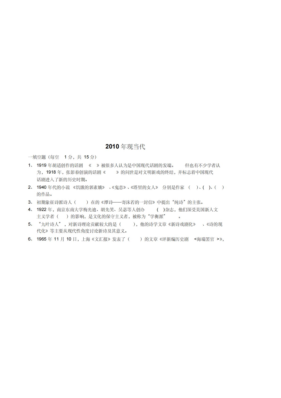 2010ÄêÏÖµ±´úÒ»Ìî¿ÕÌ⣨ÿ¿Õ1·Ö£¬¹²15·Ö£©1¡¢1919ÄêºúÊÊ´´×÷µÄ»°¾ç¡¶¡·±»ºÜ¶àÈËÈÏΪÊÇÖйúÏÖ´ú»°¾çµÄ·¢¶Ë¡£µ«Ò²Óв»ÉÙѧÕßÈÏ¡·µÄÎÊÊÀÊǶÔÎÄÃ÷ÐÂÏ·µÄÖսᣬ²¢±êÖ¾×ÅÖйúÏÖ´úΪ£¬1918Ä꣬ÕÅÅí´º´´Ñݵϰ¾ç¡¶»°¾ç½øÈëÁËеÄÀúʷʱÆÚ¡£2¡¢1940Äê´úµÄС˵¡¶¼¢¶öµÄ¹ùËØ¶ð¡·¡¢¡¶¹íÁµ¡·¡¢¡¶ËþÀïµÄÅ®ÈË¡··Ö±ðÊÇ×÷¼Ò£¨£©¡¢()¡¢£¨£©µÄ×...