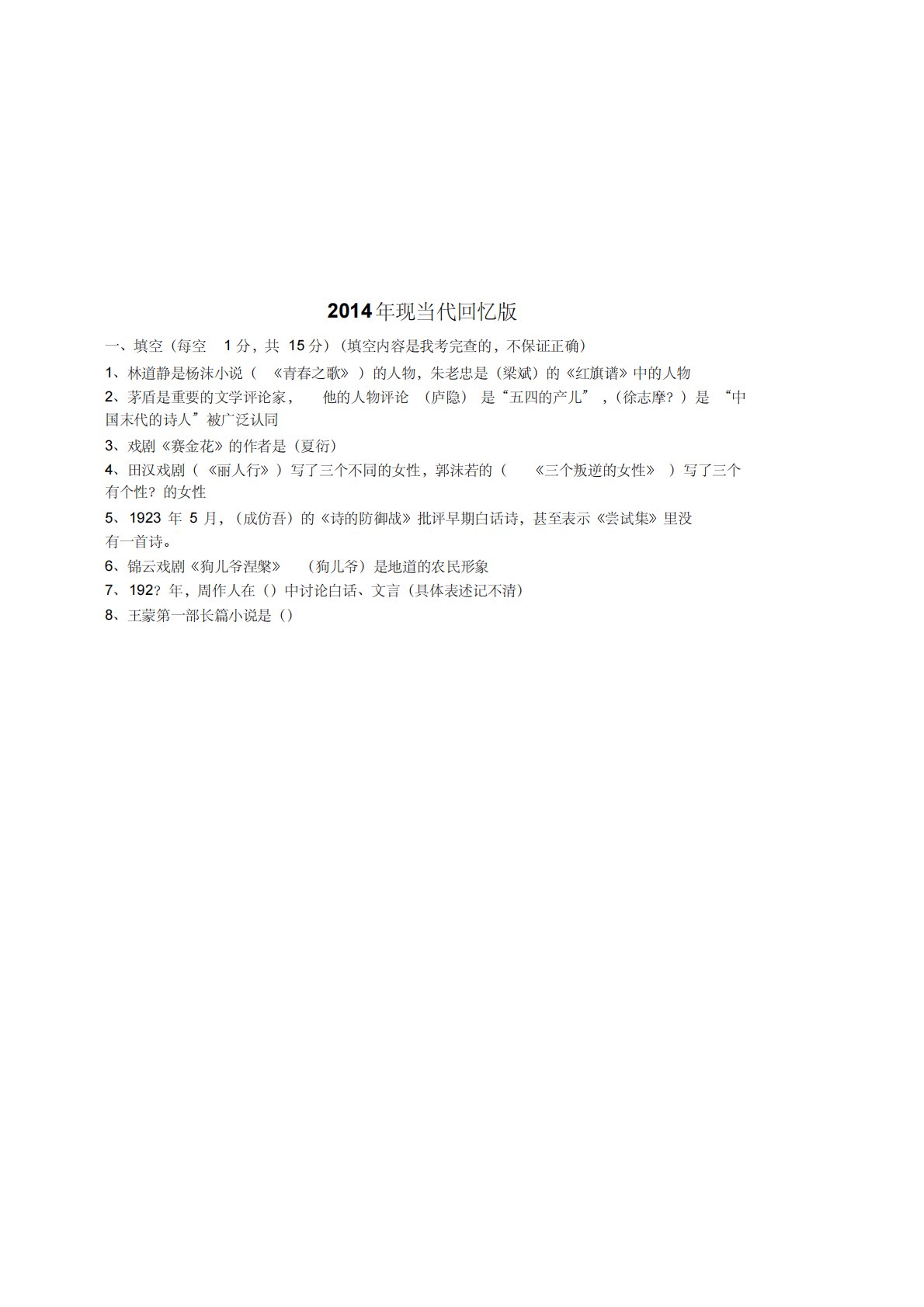 2014ÄêÏÖµ±´ú»ØÒä°æÒ»¡¢Ìî¿Õ£¨Ã¿¿Õ1·Ö£¬¹²15·Ö£©£¨Ìî¿ÕÄÚÈÝÊÇÎÒ¿¼Íê²éµÄ£¬²»±£Ö¤ÕýÈ·£©1¡¢ÁÖµÀ¾²ÊÇÑîÄС˵£¨¡¶Çà´ºÖ®¸è¡·£©µÄÈËÎÖìÀÏÖÒÊÇ£¨Áº±ó£©µÄ¡¶ºìÆìÆ×¡·ÖеÄÈËÎïËûµÄÈËÎïÆÀÂÛ£¨Â®Òþ£©ÊÇ¡°ÎåËĵIJú¶ù¡±£¬£¨Ðì־Ħ£¿£©ÊÇ¡°ÖÐ2¡¢Ã©¶ÜÊÇÖØÒªµÄÎÄѧÆÀÂÛ¼Ò£¬¹úÄ©´úµÄÊ«ÈË¡±±»¹ã·ºÈÏͬ3¡¢Ï·¾ç¡¶Èü½ð»¨¡·µÄ×÷ÕßÊÇ£¨ÏÄÑÜ£©...
