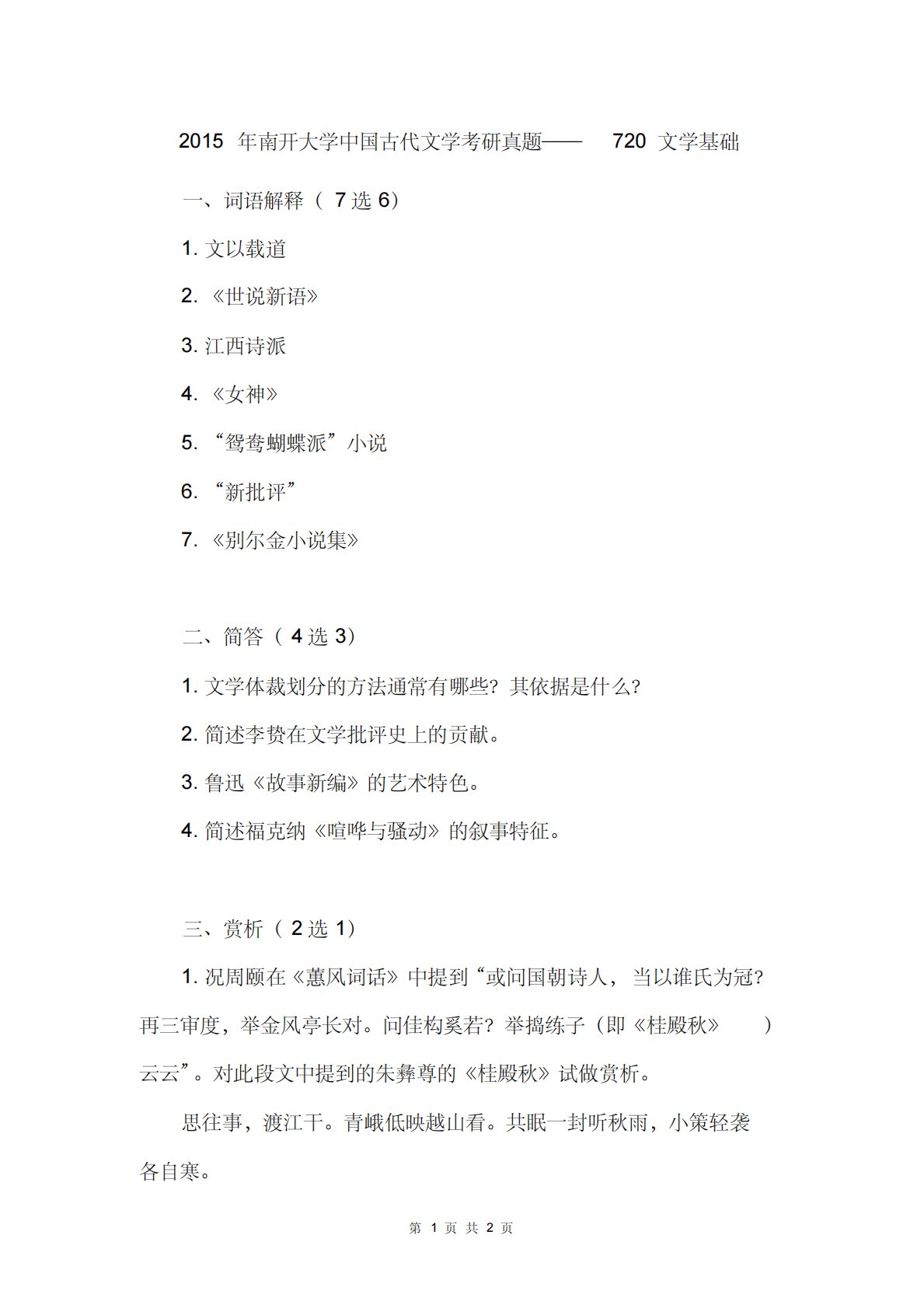 µÚ1ҳ¹²2ҳ2015ÄêÄÏ¿ª´óѧÖйú¹Å´úÎÄѧ¿¼ÑÐÕæÌ⡪¡ª720ÎÄѧ»ù´¡Ò»¡¢´ÊÓï½âÊÍ£¨7ѡ6£©1.ÎÄÒÔÔØµÀ2.¡¶ÊÀ˵ÐÂÓï¡·3.½Î÷Ê«ÅÉ4.¡¶Å®Éñ¡·5.¡°Ô§ÑìºûµûÅÉ¡±Ð¡Ëµ6.¡°ÐÂÅúÆÀ¡±7.¡¶±ð¶û½ðС˵¼¯¡·¶þ¡¢¼ò´ð£¨4ѡ3£©1.ÎÄѧÌå²Ã»®·ÖµÄ·½·¨Í¨³£ÓÐÄÄЩ£¿ÆäÒÀ¾ÝÊÇʲô£¿2.¼òÊöÀîêÞÔÚÎÄѧÅúÆÀÊ·ÉϵűÏס£3.³Ѹ¡¶¹ÊÊÂбࡷµÄÒÕÊõÌØÉ«¡£4.¼òÊö¸...
