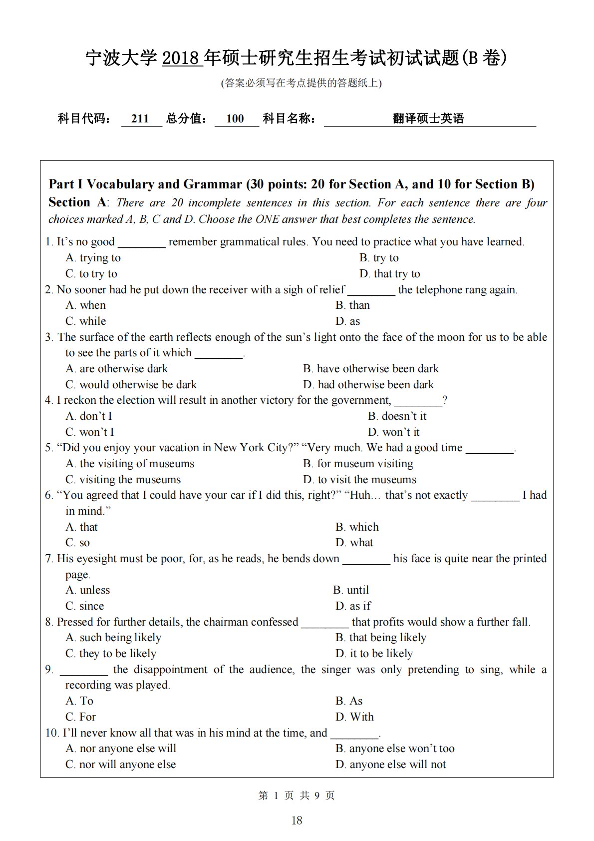 宁波大学2018年硕士研究生招生考试初试试题(B卷)(答案必须写在考点提供的答题纸上)第1页共9页科目代码:211总分值:100科目名称:翻译硕士英语PartIVocabularyandGrammar(30points:20forSectionA,and10forSectionB)SectionA:Thereare20incompletesentencesinthissection.ForeachsentencetherearefourchoicesmarkedA,B,CandD.ChoosetheONEanswerthatbestcompletesthesentence.1.It’snogo...