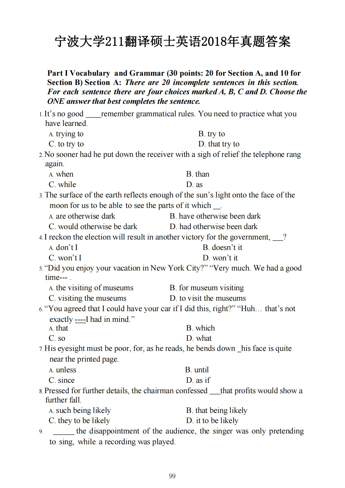 宁波大学211翻译硕士英语2018年真题答案PartIVocabularyandGrammar(30points:20forSectionA,and10forSectionB)SectionA:Thereare20incompletesentencesinthissection.ForeachsentencetherearefourchoicesmarkedA,B,CandD.ChoosetheONEanswerthatbestcompletesthesentence.1.It’snogoodremembergrammaticalrules.Youneedtopracticewhatyouha...