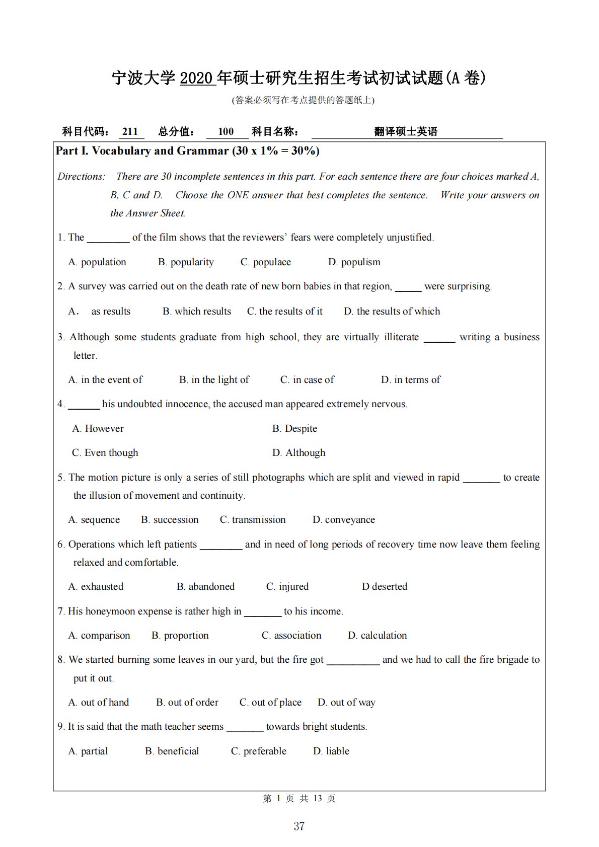 宁波大学2020年硕士研究生招生考试初试试题(A卷)(答案必须写在考点提供的答题纸上)第1页共13页科目代码:211总分值:100科目名称:翻译硕士英语PartI.VocabularyandGrammar(30x1%=30%)Directions:Thereare30incompletesentencesinthispart.ForeachsentencetherearefourchoicesmarkedA,B,CandD.ChoosetheONEanswerthatbestcompletesthesentence.WriteyouranswersontheAnswerSheet.1.The_...