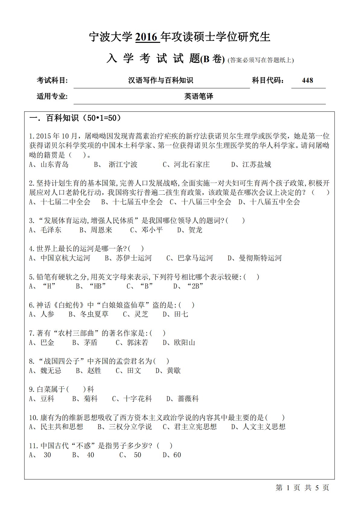 宁波大学2016年攻读硕士学位研究生入学考试试题(B卷)(答案必须写在答题纸上)考试科目:汉语写作与百科知识科目代码:448适用专业:英语笔译第1页共5页一.百科知识(50•1=50)1.2015年10月,屠呦呦因发现青蒿素治疗疟疾的新疗法获诺贝尔生理学或医学奖,她是第一位获得诺贝尔科学奖项的中国本土科学家、第一位获得诺贝尔生理医学奖的华人科学家。请问屠呦呦的籍贯是()。A、山东青岛B、浙江宁波C、河北石家庄D、江苏盐城2.坚持计划生育的基本国策,完善人口发展战略,全面实施一对夫妇可生育两个孩子政策,积极开展应对人口老龄化行动,我国将实行普遍二孩生育政策,该政策是在哪次会议上决定的?()A、十...