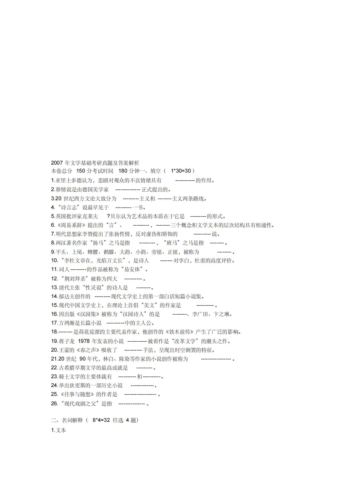 2007ÄêÎÄѧ»ù´¡¿¼ÑÐÕæÌâ¼°´ð°¸½âÎö±¾¾í×Ü·Ö150·Ö¿¼ÊÔʱ¼ä180·ÖÖÓÒ»¡¢Ìî¿Õ£¨1*30=30£©1.ÑÇÀïÊ¿¶àµÂÈÏΪ£¬±¯¾ç¶Ô¹ÛÖڵIJ»Á¼ÇéÐ÷¾ßÓÐ-----------µÄ×÷Óá£2.ÒÆÇé˵ÊÇÓɵ¹úÃÀѧ¼Ò--------------ÕýʽÌá³öµÄ¡£3.20ÊÀ¼ÍÎ÷·½ÎÄÂÛ´óÖ·ÖΪ---------Ö÷ÒåºÍ--------Ö÷ÒåÁ½Ìõ·Ïß¡£4.¡°Ê«ÑÔÖ¾¡±Ëµ×îÔç¼ûÓÚ---------Ò»Êé¡£5.Ó¢¹úÅúÆÀ¼Ò¿Ë...