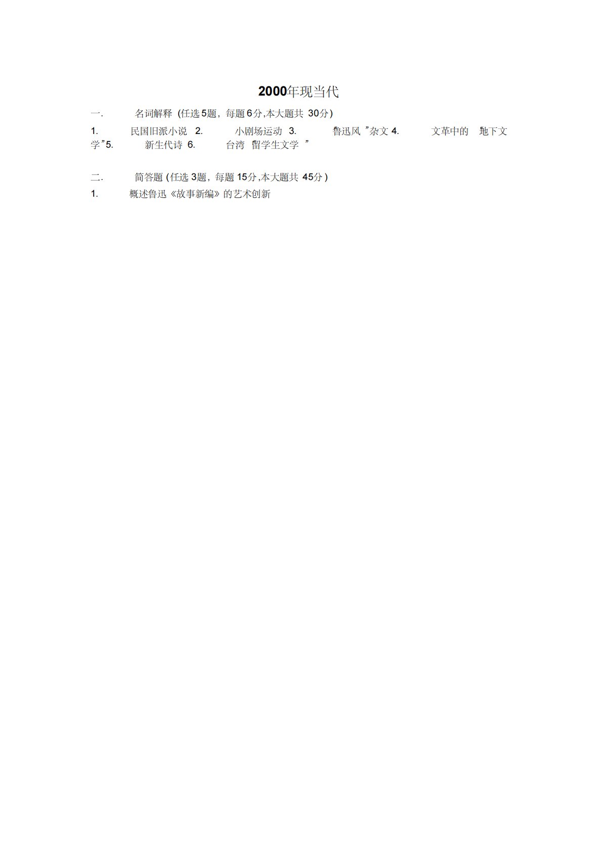 2000ÄêÏÖµ±´úһ.Ãû´Ê½âÊÍ(ÈÎÑ¡5Ìâ,ÿÌâ6·Ö,±¾´óÌâ¹²30·Ö)1.Ãñ¹ú¾ÉÅÉС˵2.С¾ç³¡Ô˶¯3.¡°Â³Ñ¸·ç¡±ÔÓÎÄ4.ÎĸïÖеġ°µØÏÂÎÄѧ¡±5.ÐÂÉú´úÊ«6.̨Íå¡°ÁôѧÉúÎÄѧ¡±¶þ.¼ò´ðÌâ(ÈÎÑ¡3Ìâ,ÿÌâ15·Ö,±¾´óÌâ¹²45·Ö)1.¸ÅÊö³Ѹ¡¶¹ÊÊÂбࡷµÄÒÕÊõ´´ÐÂ2000ÄêÏÖµ±´úһ.Ãû´Ê½âÊÍ(ÈÎÑ¡5Ìâ,ÿÌâ6·Ö,±¾´óÌâ¹²30·Ö)1.Ãñ¹ú¾ÉÅÉС˵2.С¾ç³¡Ô˶¯3.¡°Â...