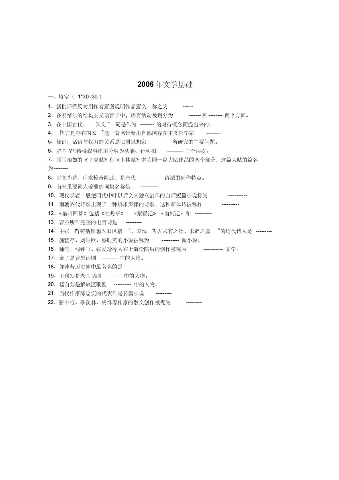2006ÄêÎÄѧ»ù´¡------Ò»¡¢Ìî¿Õ£¨1*30=30£©1¡¢ÐÂÅúÆÀÅÉ·´¶ÔÓÃ×÷ÕßÒâͼ˵Ã÷×÷Æ·ÒâÒ壬³ÆÖ®Îª2¡¢ÔÚË÷Ð÷¶ûµÄ½á¹¹Ö÷ÒåÓïÑÔѧÖУ¬ÓïÑԻ±»»®·ÖΪ-------ºÍ--------Á½¸ö·½Ãæ¡£3¡¢ÔÚÖйú¹Å´ú£¬¡°ÈËÎÄ¡±Ò»´ÊÊÇ×÷Ϊ--------µÄ¶Ô´ý¸ÅÄî¶øÌá³öÀ´µÄ¡£4¡¢¡°ÓïÑÔÊÇ´æÔڵļҡ±ÕâÒ»ÖøÃûÂ۶ϳö×Ե¹ú´æÔÚÖ÷ÒåÕÜѧ¼Ò--------5¡¢ÖªÊ¶¡¢»°ÓïÓëÈ...